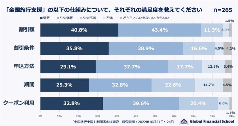 業界最多の講座数を誇る日本最大規模の金融オンラインスクール「グローバルファイナンシャルスクール」(東京都港区、市川雄一郎校長)は、10 月 11 日から開始された「全国旅行支援」を利用して旅行をしたと回答した全国 20〜60 代の男女 265 名にアンケートを行いました。