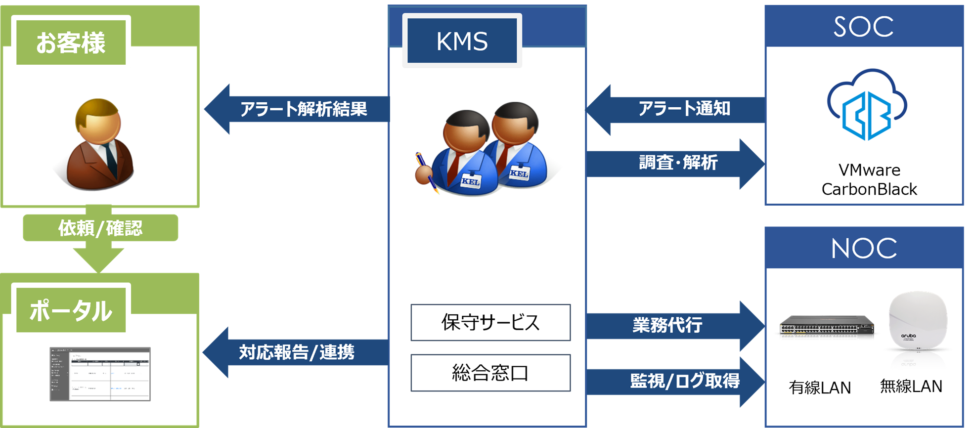 KMSのSecurity Operation Center (SOC)サービスにCarbon Blackを追加し、セキュリティ専門技術者が運用を代行することで、セキュリティレベルの向上やコスト(TCO)削減等を実現します。また、KMSのNetwork Operation Center(NOC)と組み合わせることで、SOC とNOSをシームレスに連携した運用サービスをご提供します。