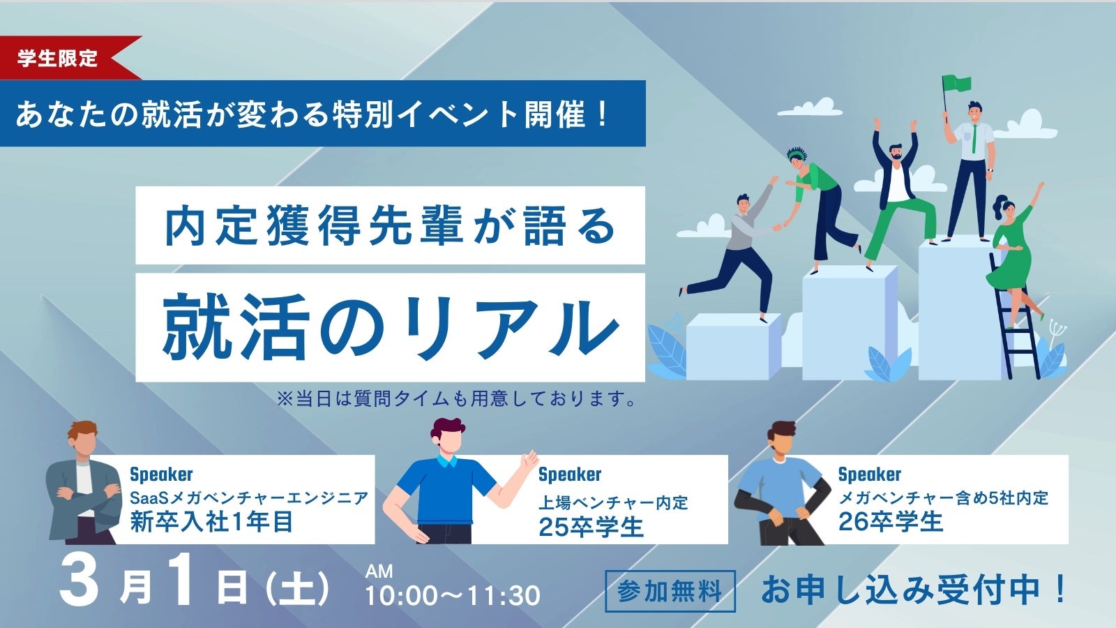 就活経験者3名が語る「就活のリアル」座談会をオンライン開催。就活の実体験やアドバイスを聞けるチャンスで、事前質問&当日対話形式の参加型イベント。