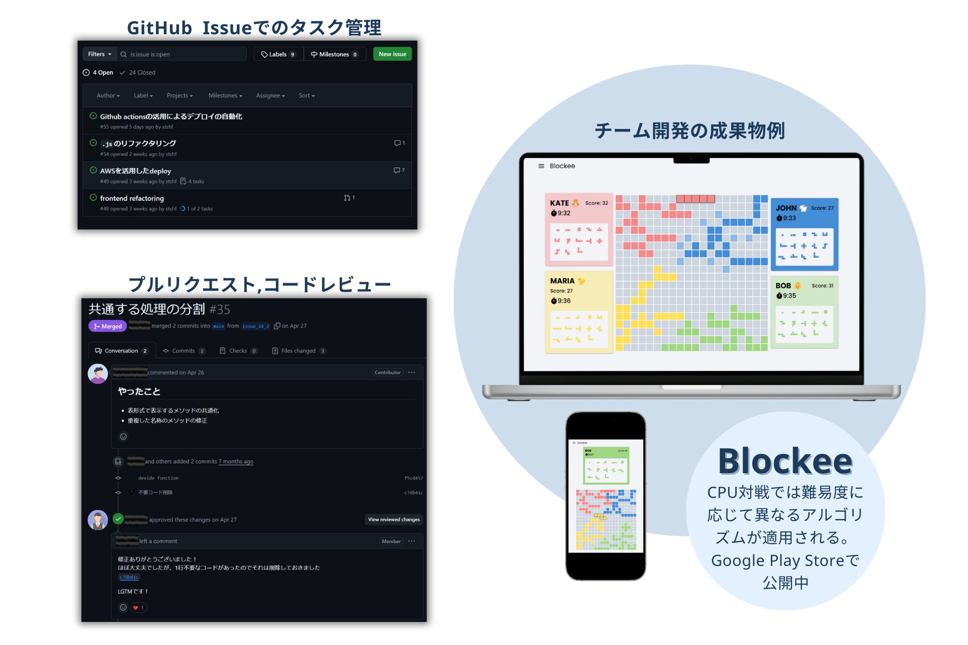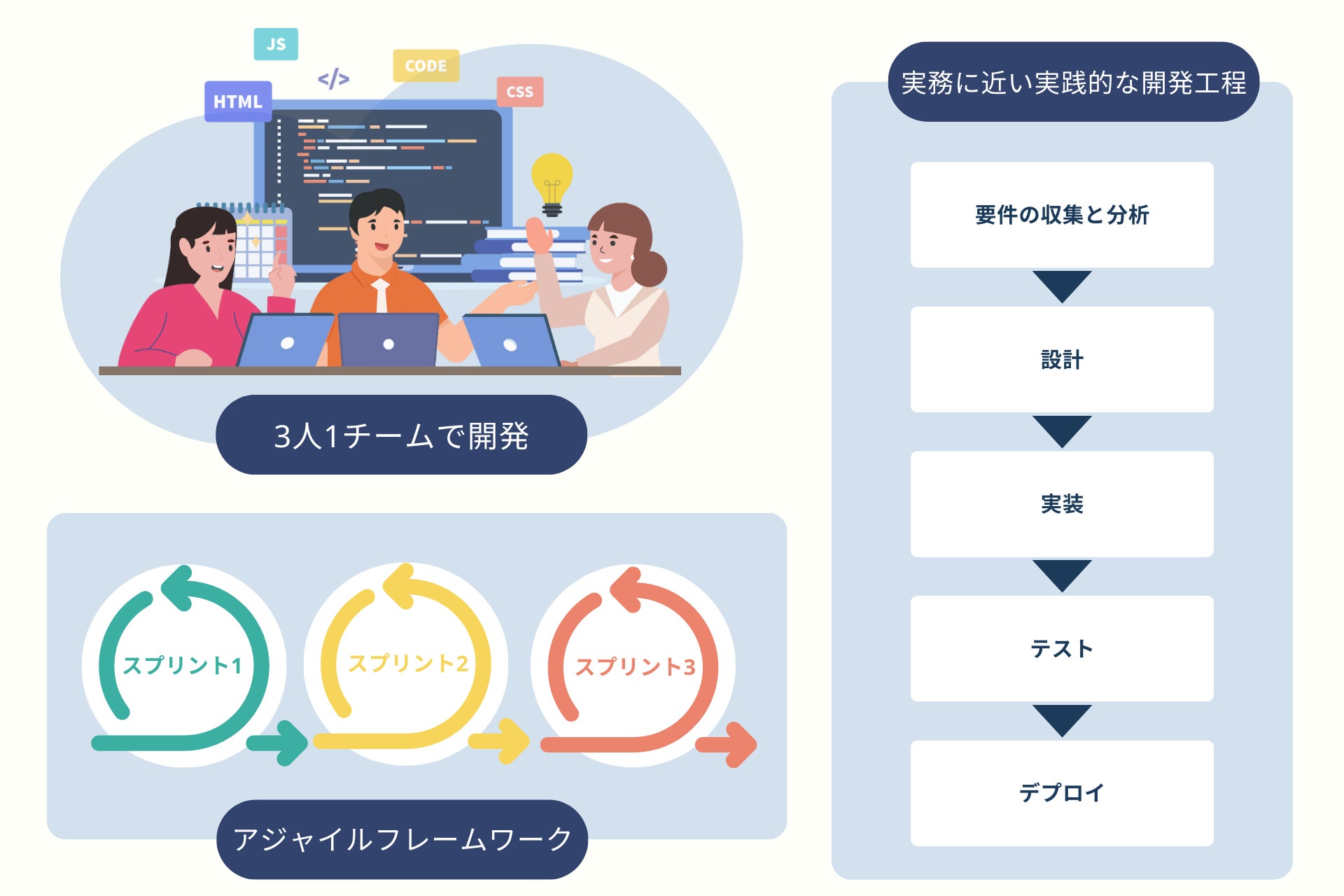 チーム開発を通じて、他の開発者と協力してプロジェクトを進めるためのノウハウを習得できます。コミュニケーションスキルや問題解決能力も磨かれ、複数人での開発における課題を自主的に解決するリーダーシップや、プロジェクト進行を円滑にする調整力も身につきます。