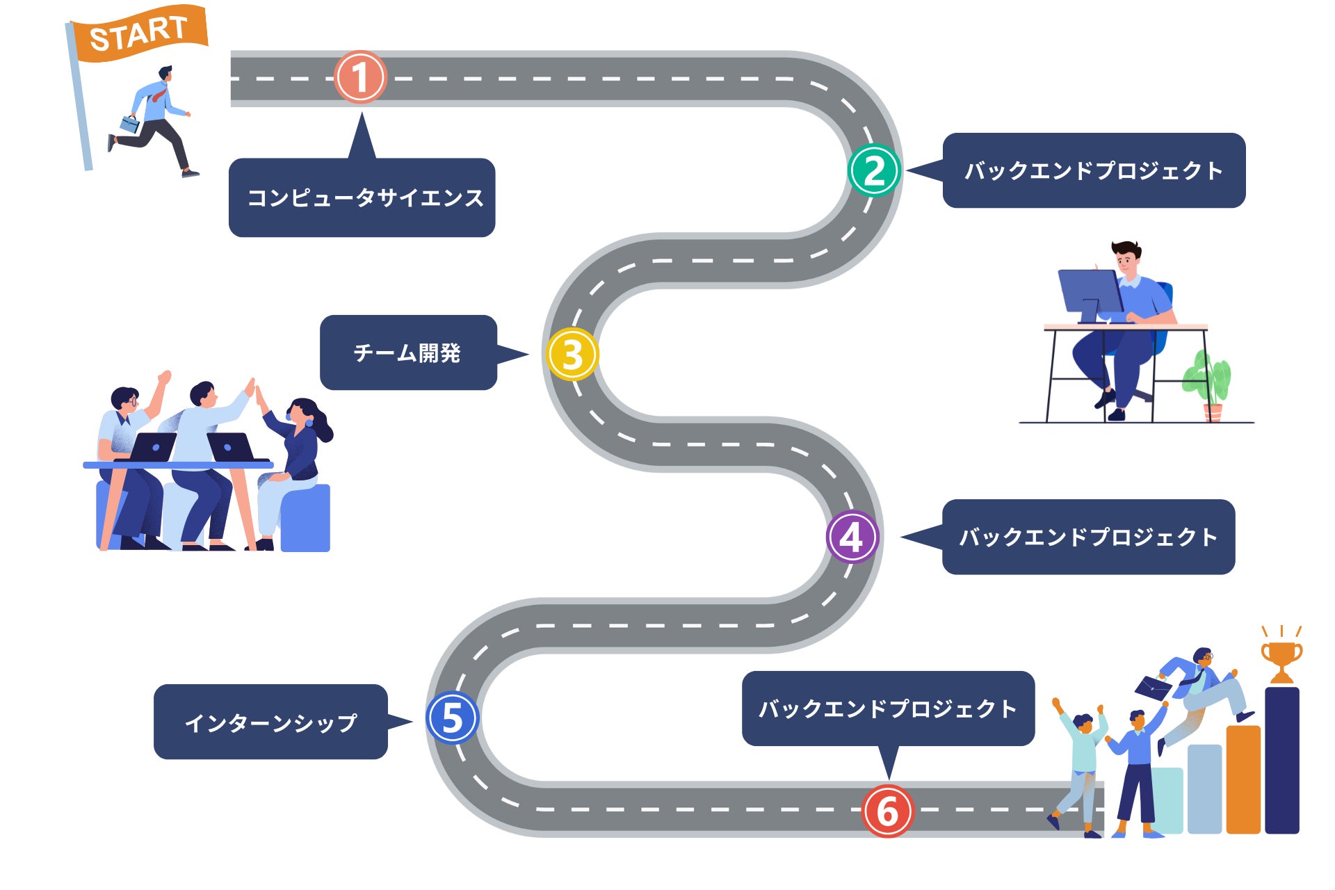 バックエンドエンジニアに必要なスキルを学習ロードマップに沿って、ステップバイステップで学習できる
