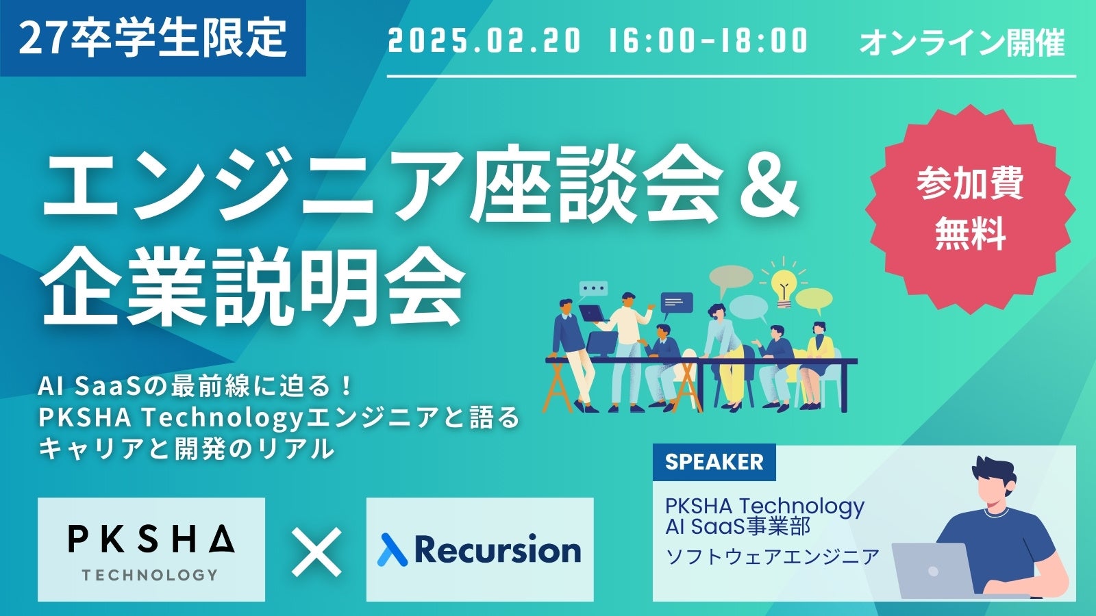 AIスタートアップ「PKSHA Technology」とのオンライン座談会&企業説明会を開催。AI技術の最前線で活躍するエンジニアの話を直接聞ける貴重な機会で、Recursionユーザー限定の招待枠もあり。