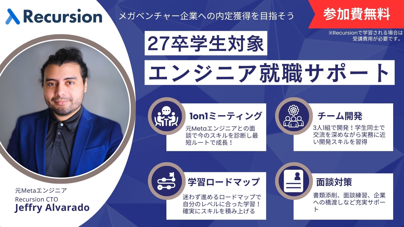Recursion, Inc(共同創業者:田島慎也、Jeffry Alvarado、本社:アメリカカリフォルニア州)が運営するコンピュータサイエンス学習サイト「Recursion」は、2027年卒業予定の学生を対象にメガベンチャーの内定獲得を目指すための「エンジニア就職サポート」の参加者募集を開始いたしました。このプログラムは、元Metaエンジニア作成のカリキュラムでバックエンドエンジニアとしてのスキルを効率よく身に付け、同じ志を持つ仲間と成長し合いながら、希望する企業への就職を目指す方を全面的にサポートするものです。