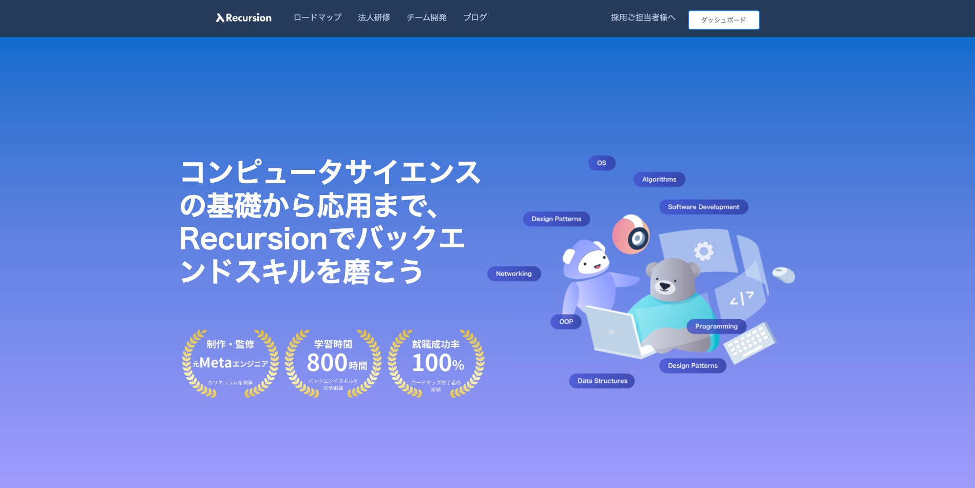 Recursionは、アメリカの大学コンピュータサイエンス課程を参考に、元Metaのソフトウェアエンジニアが立ち上げたオンライン学習サービスです。Recursionは、アウトプット中心の学習方法により、コンピュータサイエンスの基礎から応用までを効率良く学べるように設計されています。