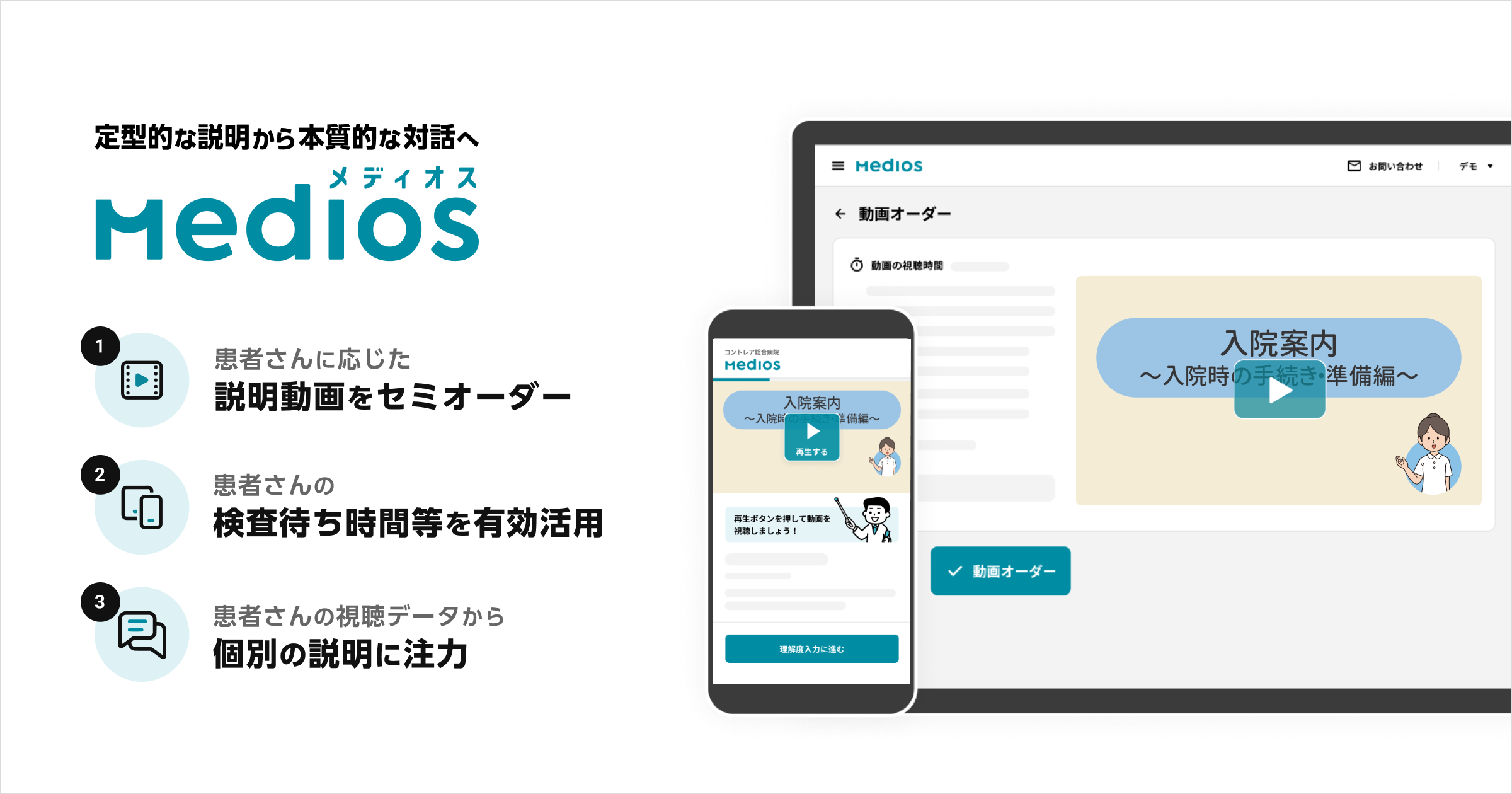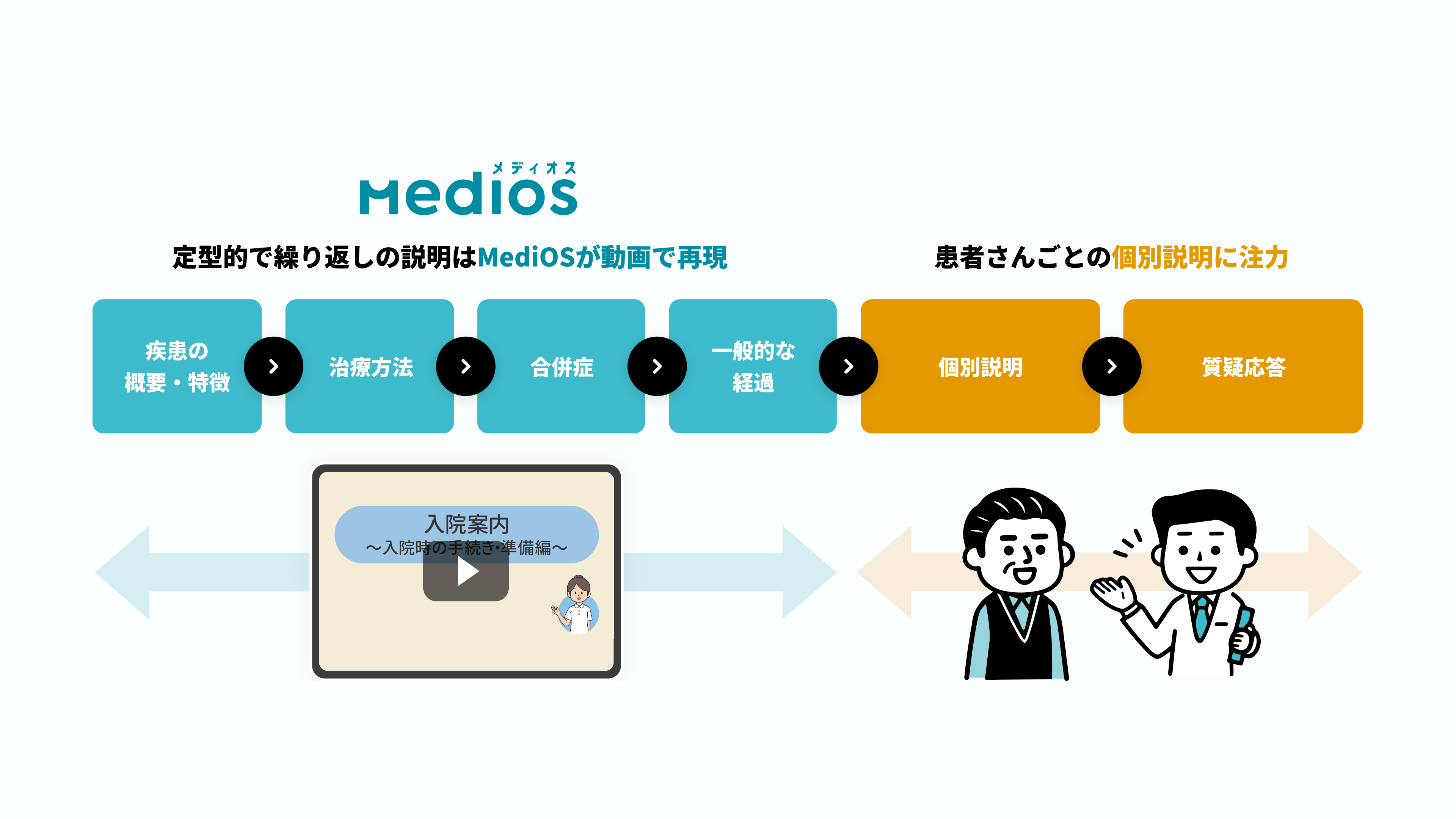 MediOSでは現在、動画説明、電子同意書のサービスをリリースしております。MediOSの動画説明サービスでは、医師が通常行う標準的な説明を動画として提供し、患者さんに事前に視聴してもらうことができます。これにより、医師は限られた診察時間を個別の説明に割り当てることができ、患者さんの意思決定をサポートするために専念できます。