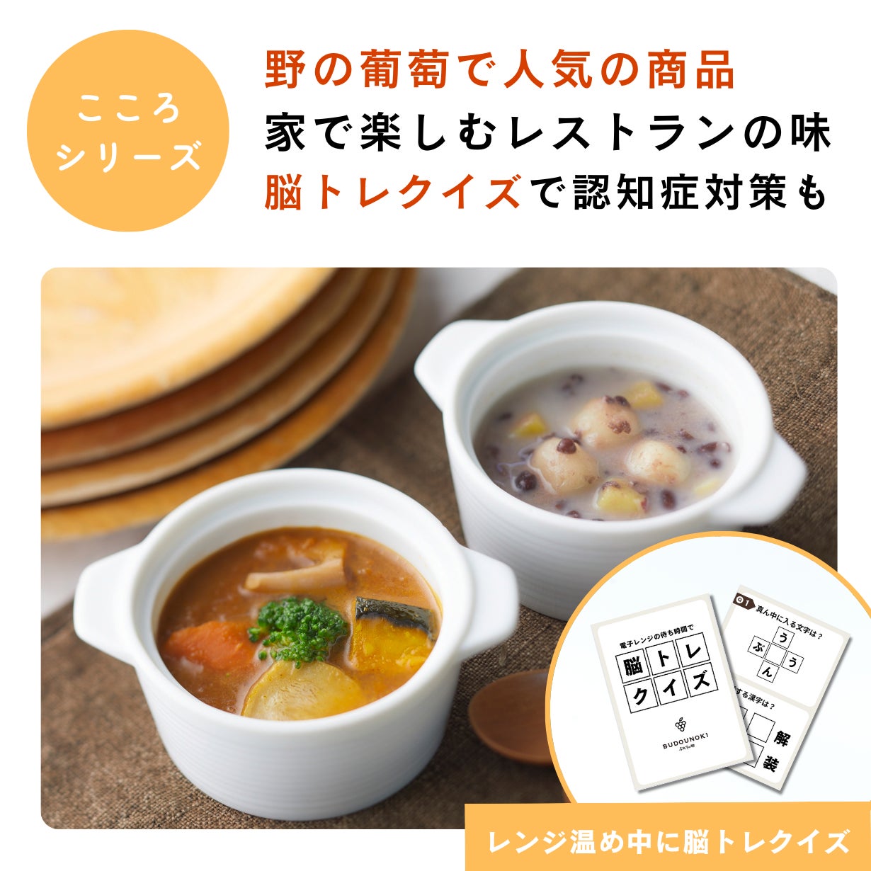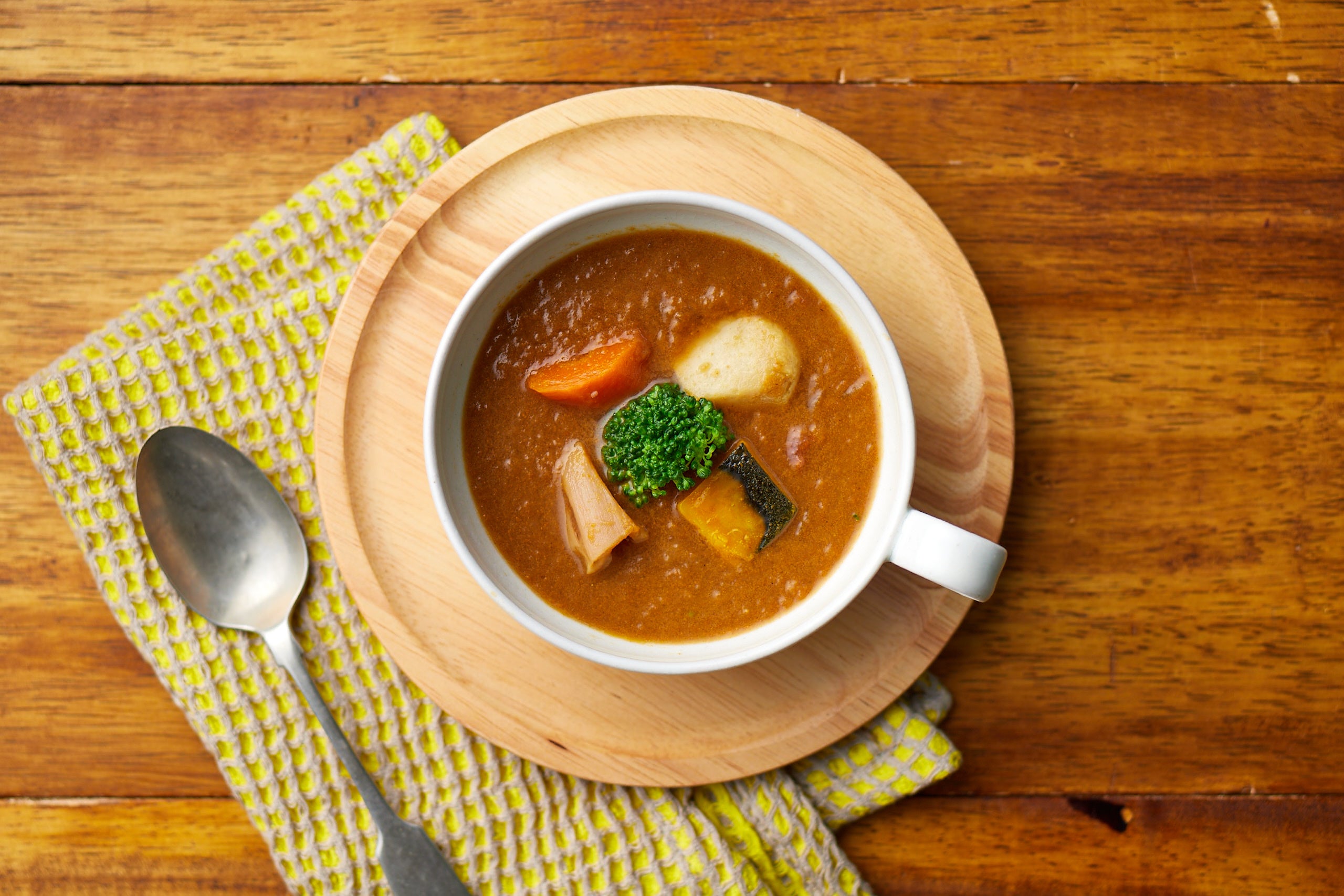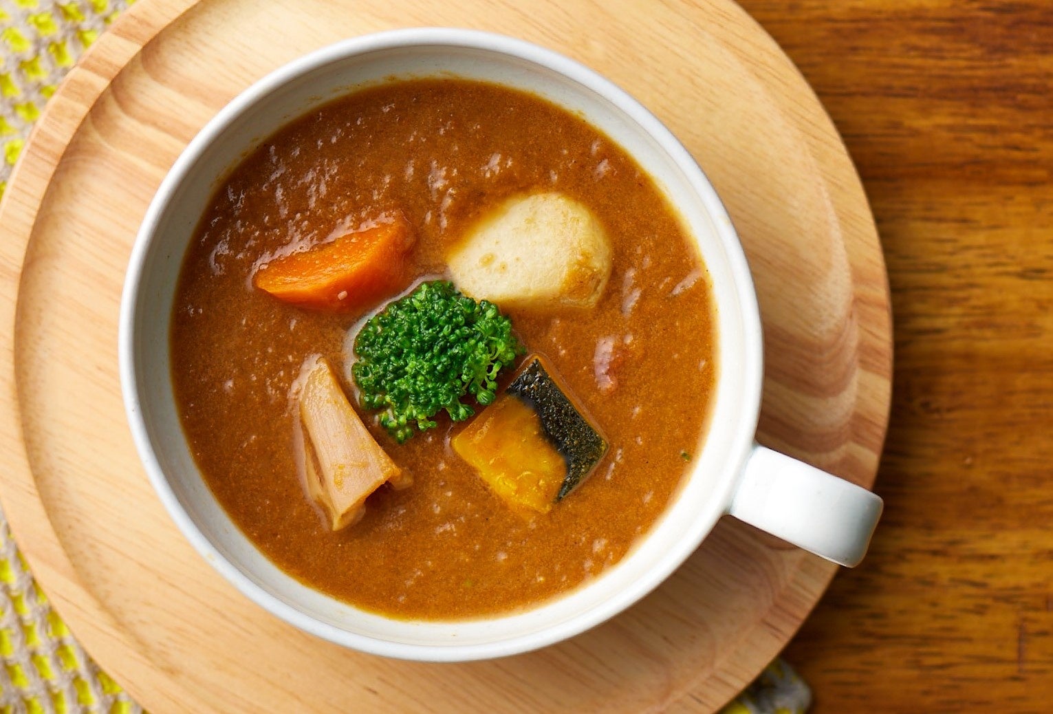 野の葡萄のオリジナル薬膳カレーにあごだしを加えた優しい味わいのスープです。ブロッコリーやレンコン等ごろごろ具材で「噛む」ことにも特化したスープです。