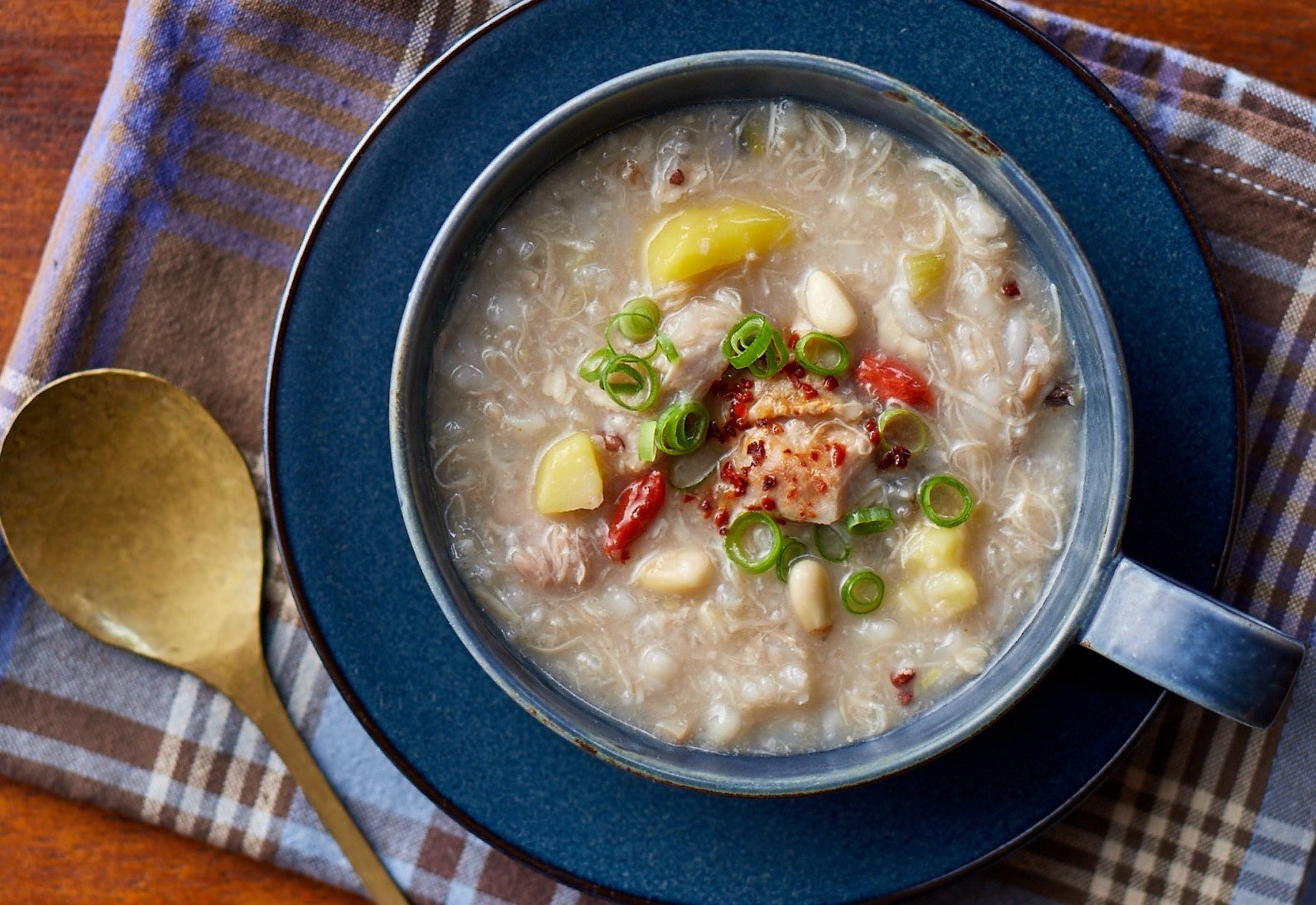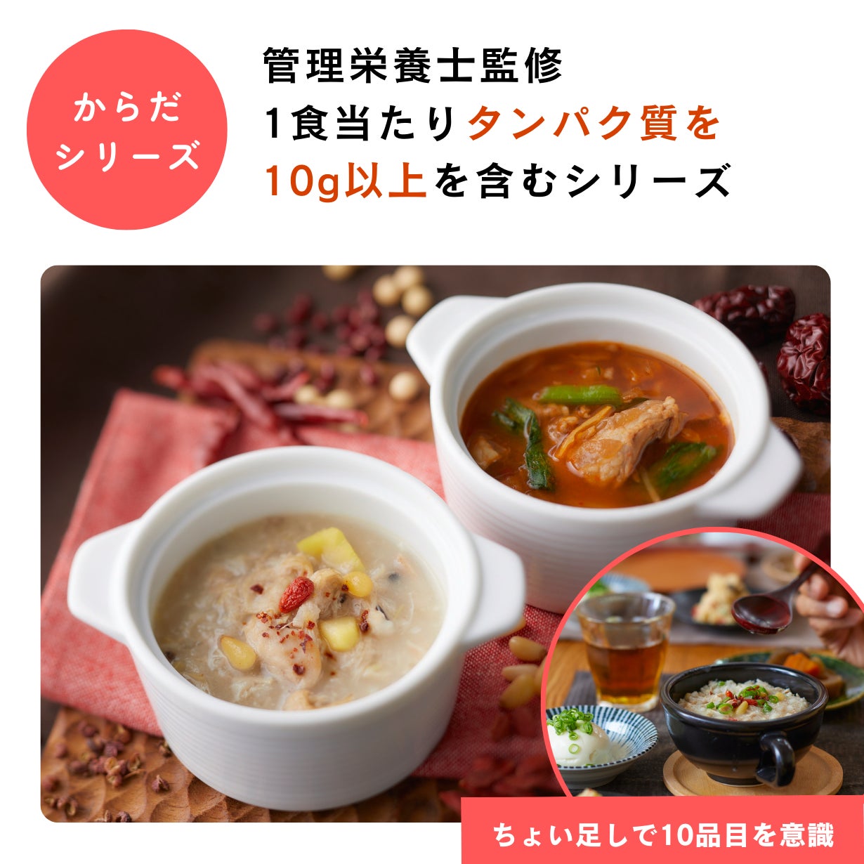 1食でたんぱく質が11.8g摂れるスープです。九州鶏ともち麦、こんにゃく米をはじめとしたオリジナル雑穀米を使用しています。なつめや松の実、くこの実、生姜等、漢方に使われる食材も使用しています。