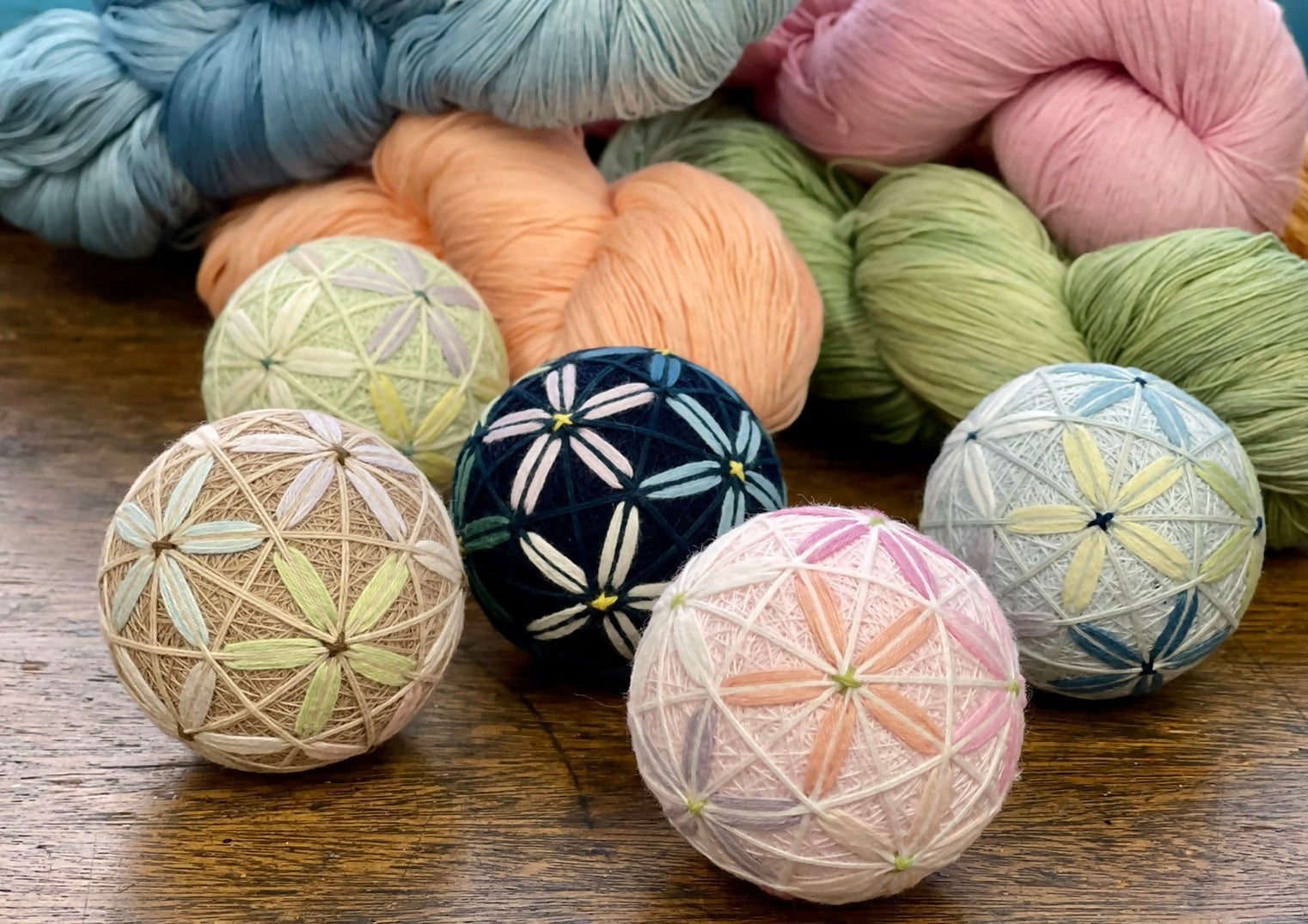 色とりどりの糸を使って、幾何学模様や花模様を作っていく「讃岐かがり手まり」。ワークショップで手まり作りに挑戦できます。