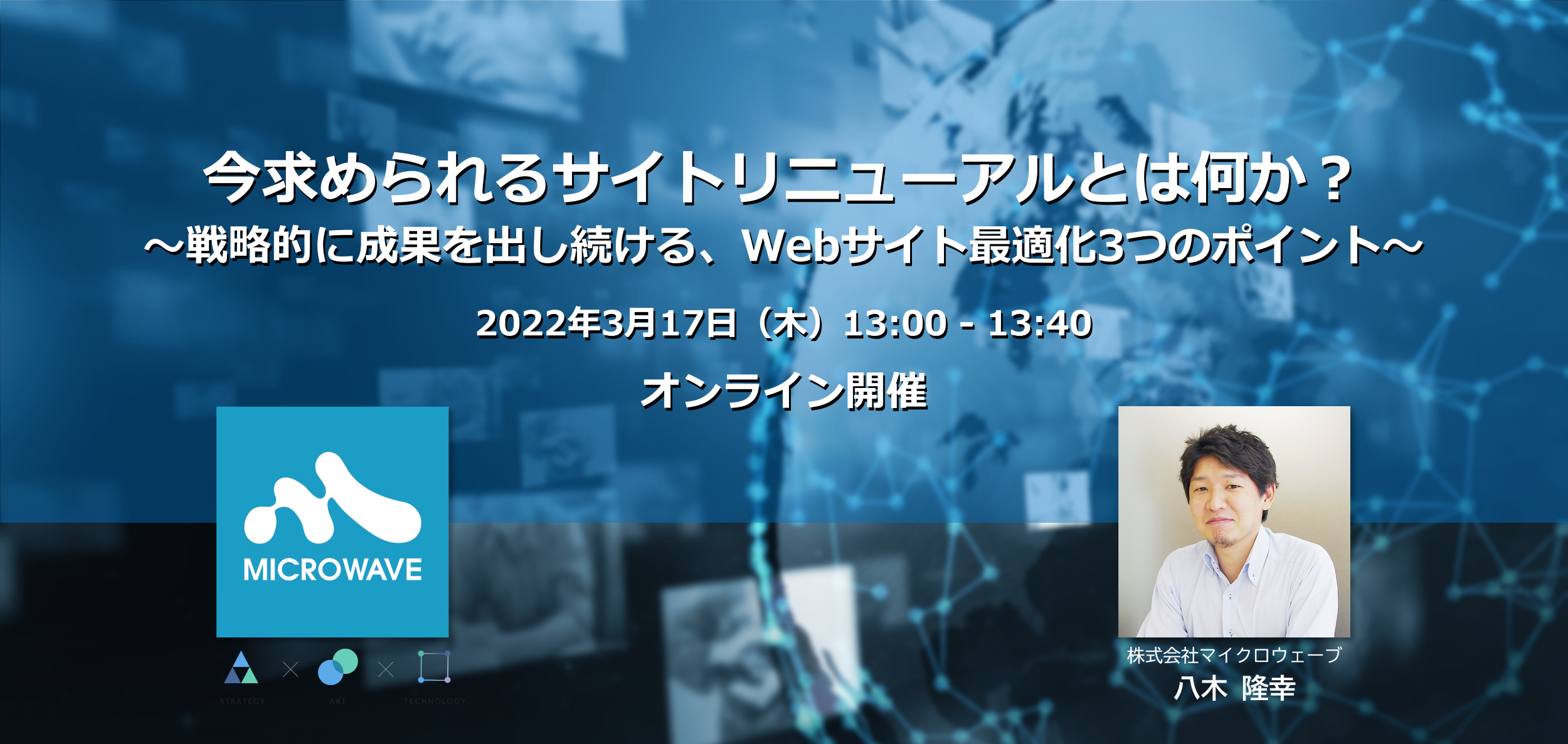 企業のデジタル戦略・DXの総合支援を手掛ける株式会社マイクロウェーブ(本社:東京都渋谷区、代表取締役:加藤孝光)は、「今求められるサイトリニューアルとは何か? ~戦略的に成果を出し続ける、Webサイト最適化3つのポイント~」と題した無料オンラインセミナーを2022年3月17日(木)に開催いたします。