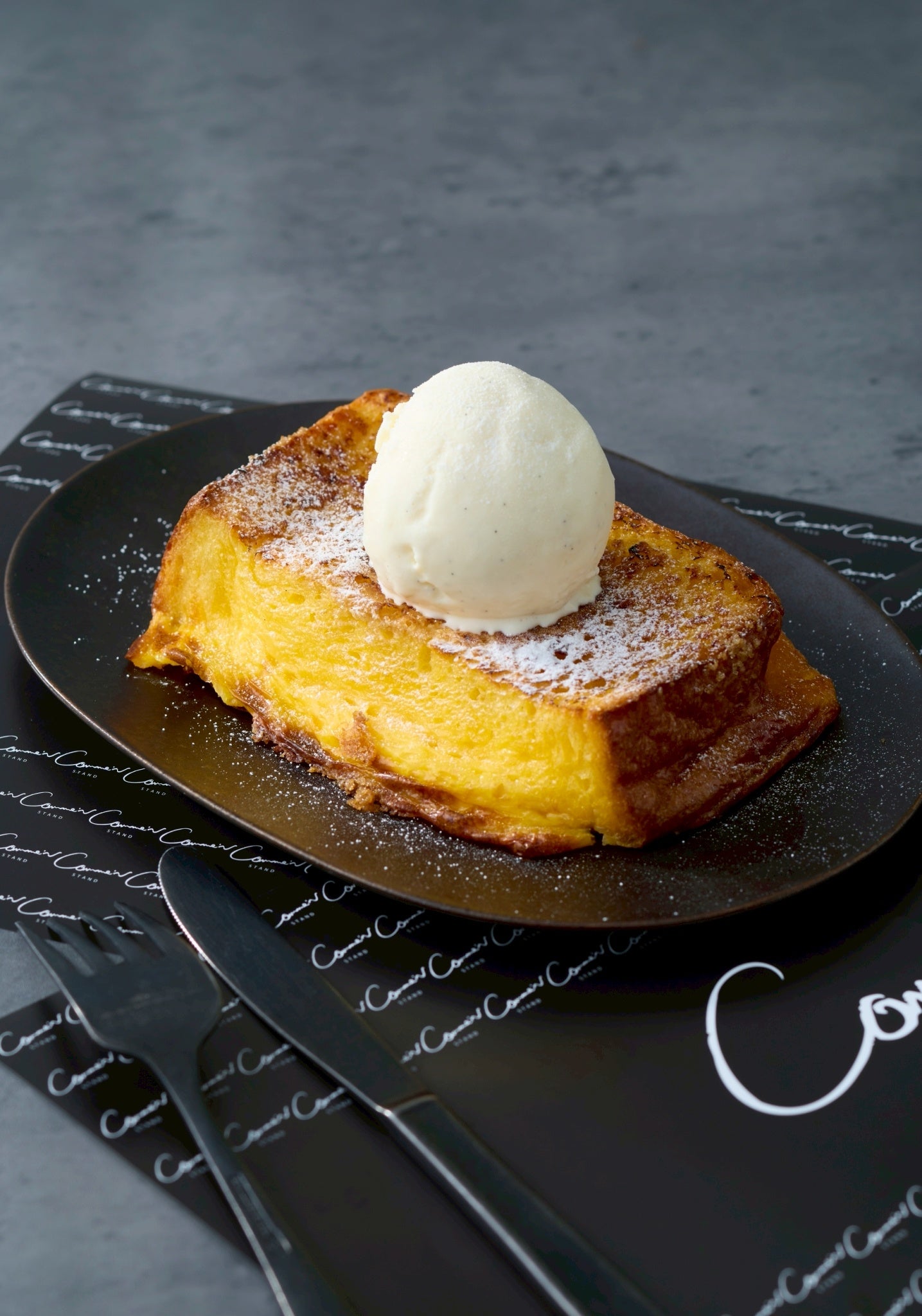 Comme'N TOKYOで人気を博したフレンチトーストをさらに進化させた、 Comme'N STAND限定メニューの「フレンチトースト」。看板商品「パンドミ」にたっぷりと卵液を染み込ませ、オーダーを受けてから一枚ずつ丁寧に焼き上げています。焼き立てアツアツのトーストに冷たいバニラアイスをのせると、口の中でふわっと溶け合うような幸福感に包まれるひと皿に。
