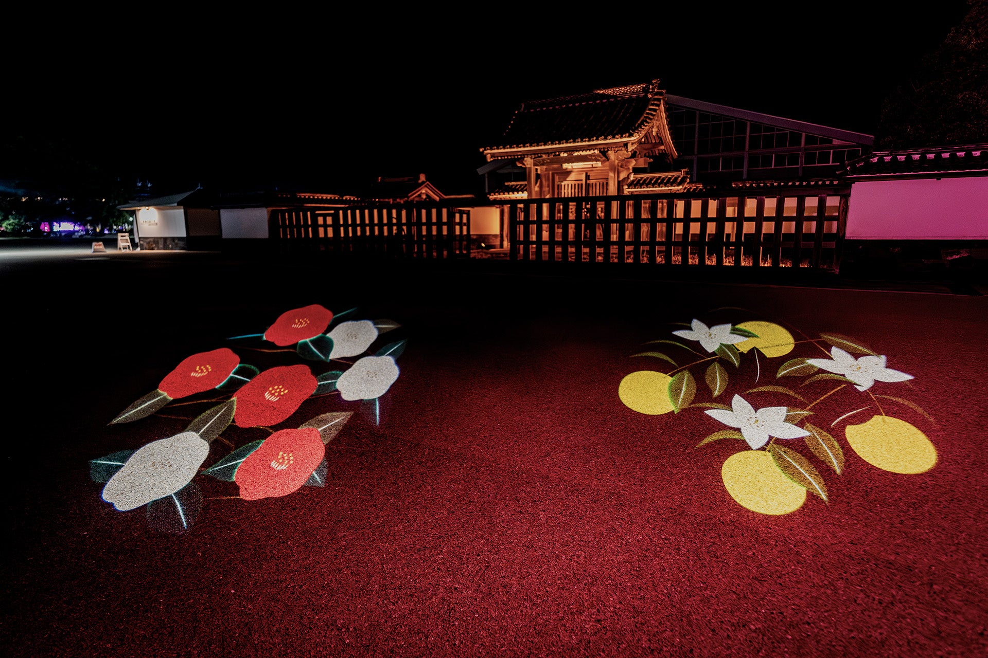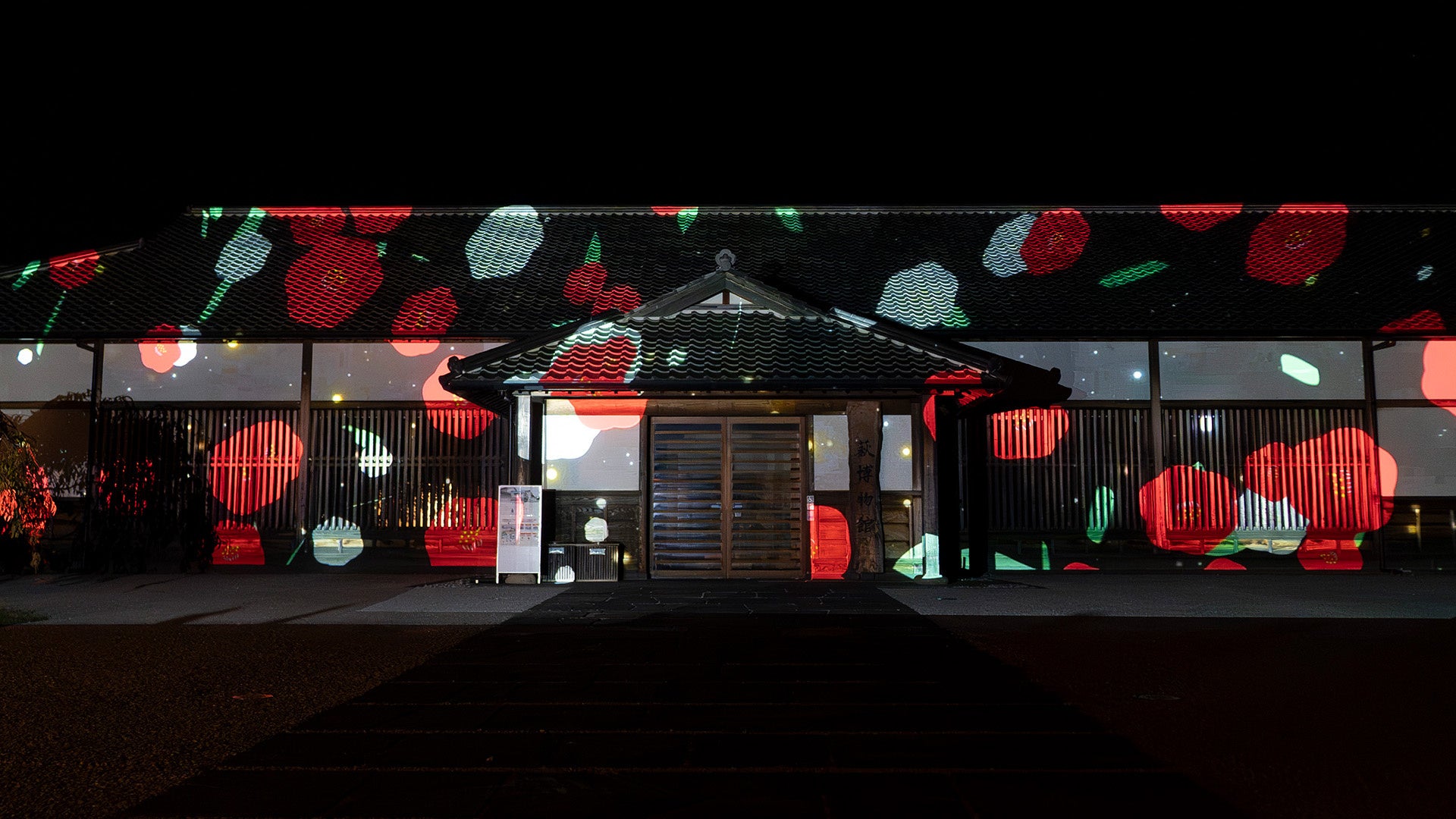 ナイトミュージーアムイベントに先駆けて「着物ウィークin萩」にあわせて菊屋家住宅付近、香雪園、萩・明倫学舎、萩博物館(隅矢倉・本館外壁)のエリアにも映像演出を行い、夜の萩城下町散策に彩りをそえています。