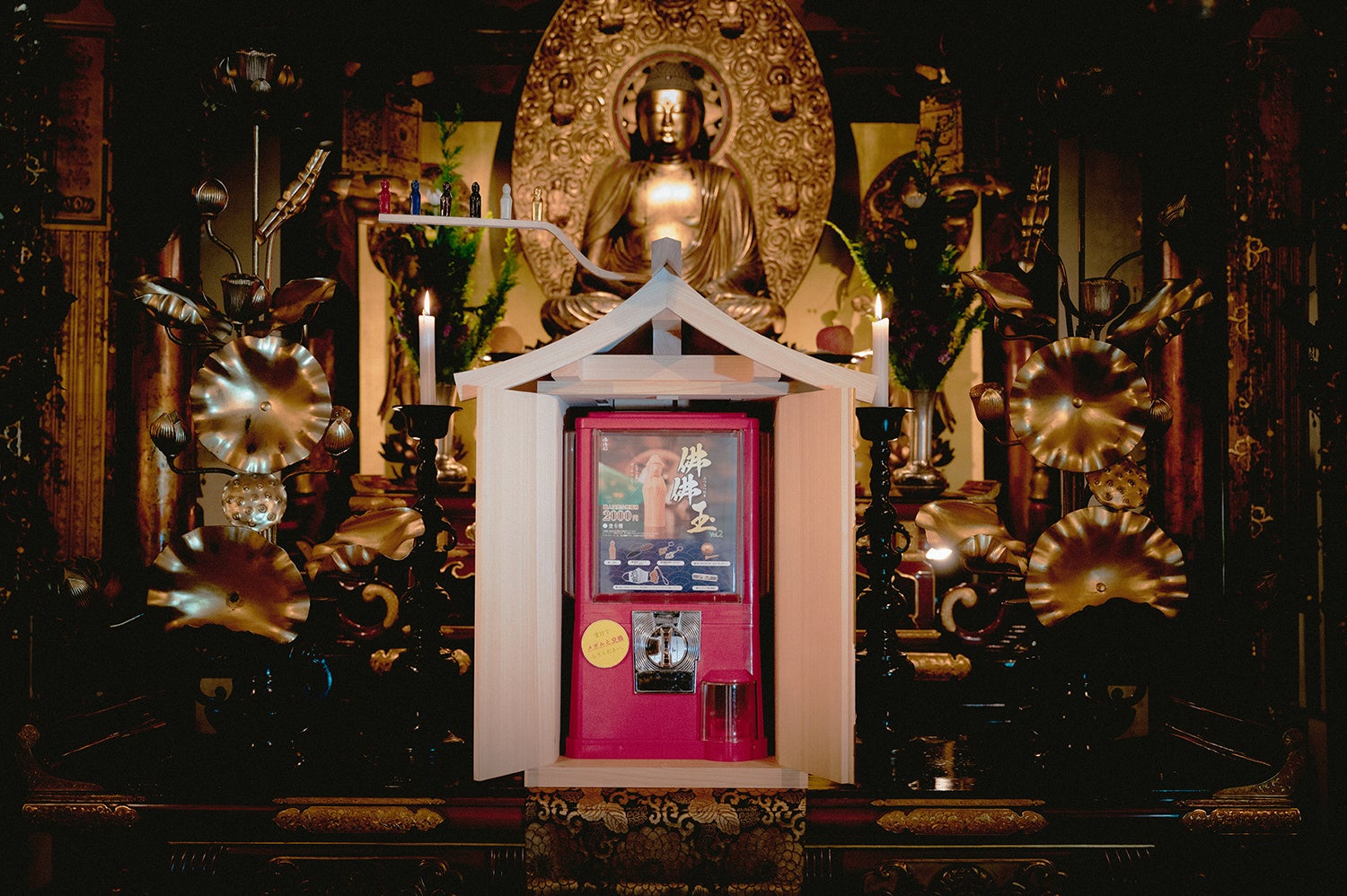 マシンが納められているのは、世界に一つしかない専用のお厨子。社寺建築 設計施工を手がける匠弘堂の宮大工が屋根を、仏師の三浦耀山が桁下本体を担当するなど、佛佛部の職人の総力を結集して制作されました。一級品のヒノキ材を用いているため、香りまで楽しめる仕様です。