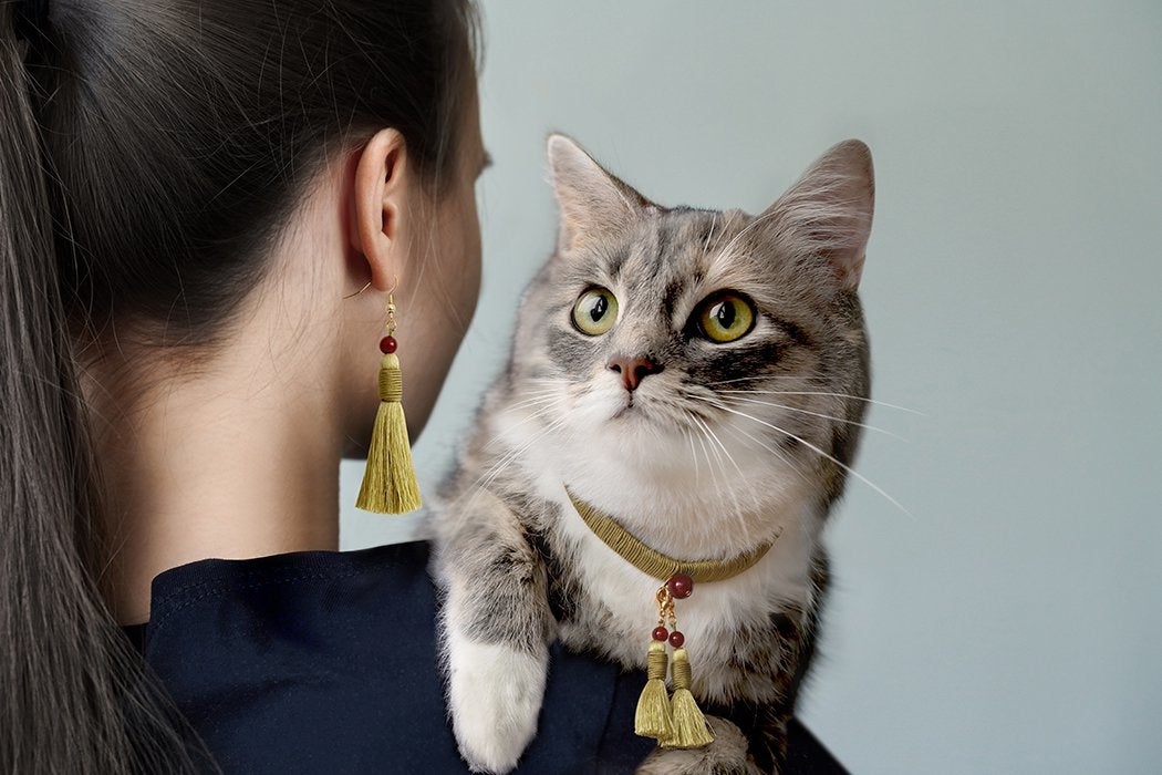【写真上:紫水晶グラデーション 京の匠監修 ¥16,500/ローズクォーツ×白メノウ「桜月」¥13,200 写真下:ねこのわピアス¥3,300/ねこのわ猫用ネックレス(首輪)¥18,700】他....