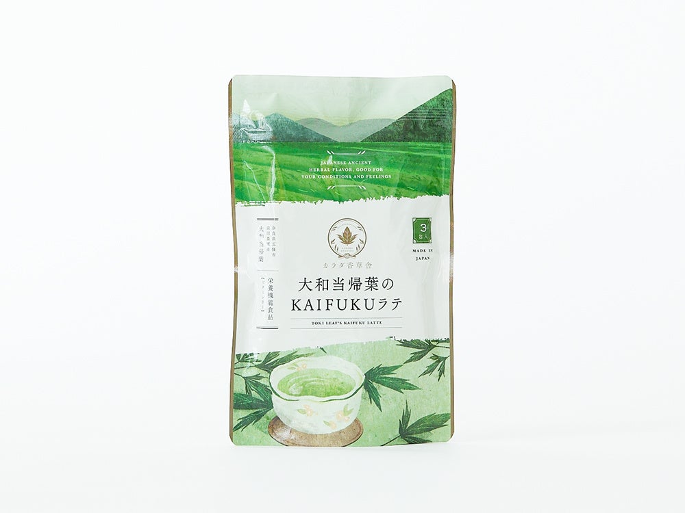 和漢ハーブの香りをたのしむ、大和当帰葉入り抹茶ミルク味のラテ。健康をめざす方の、ちいさな習慣を応援するドリンクです。【写真:大和当帰葉のKAIFUKUラテ 10包入¥2,650】他....