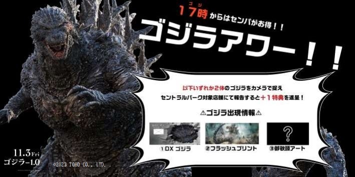 夕方「ゴジラ」5時からは映画タイトルに合わせて、ゴジラのおなじみの曲が流れ、3つの企画による「ゴジラのフォト」を店舗で提示すると「+1」の特典を進呈する「ゴジラアワー」を設けています。