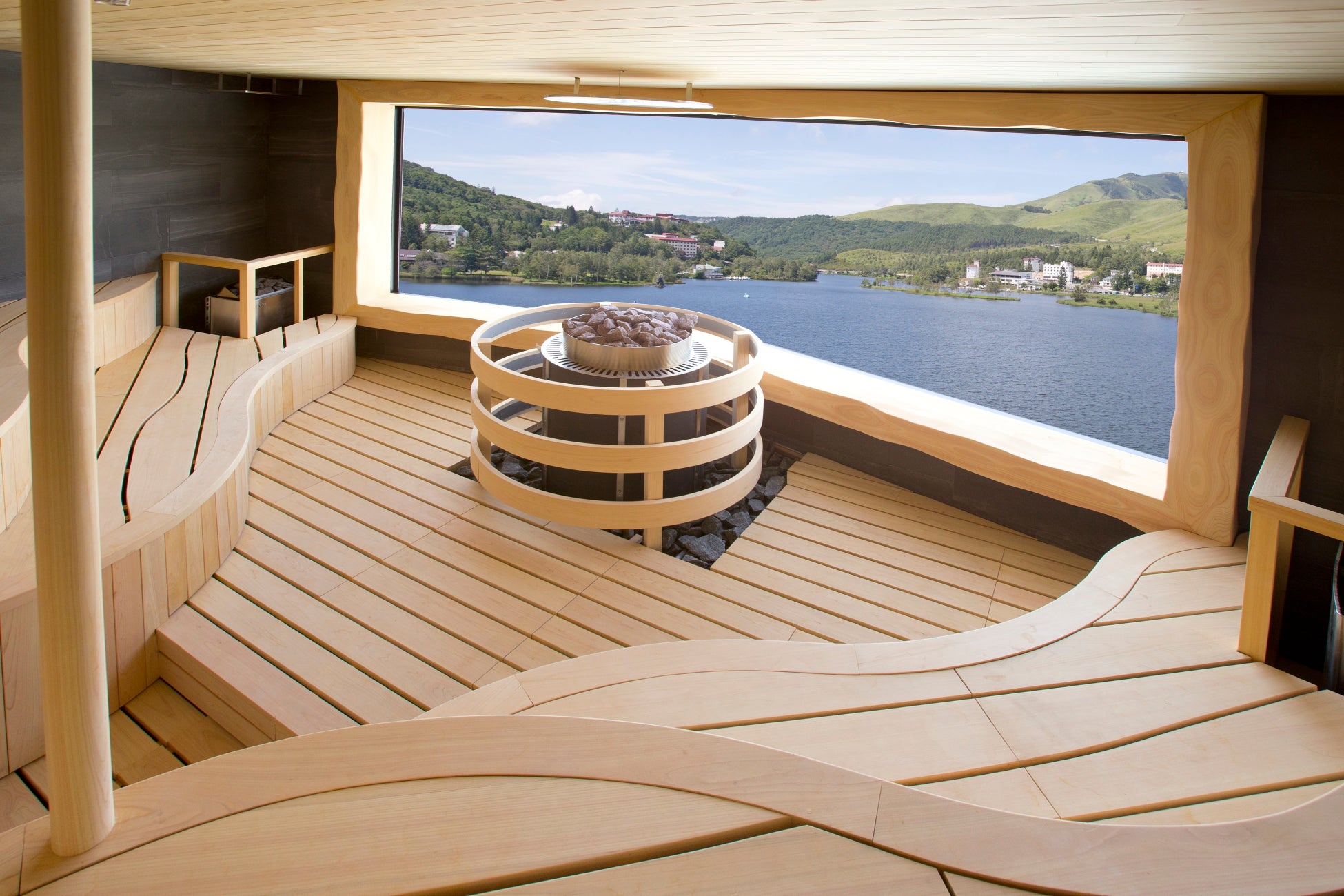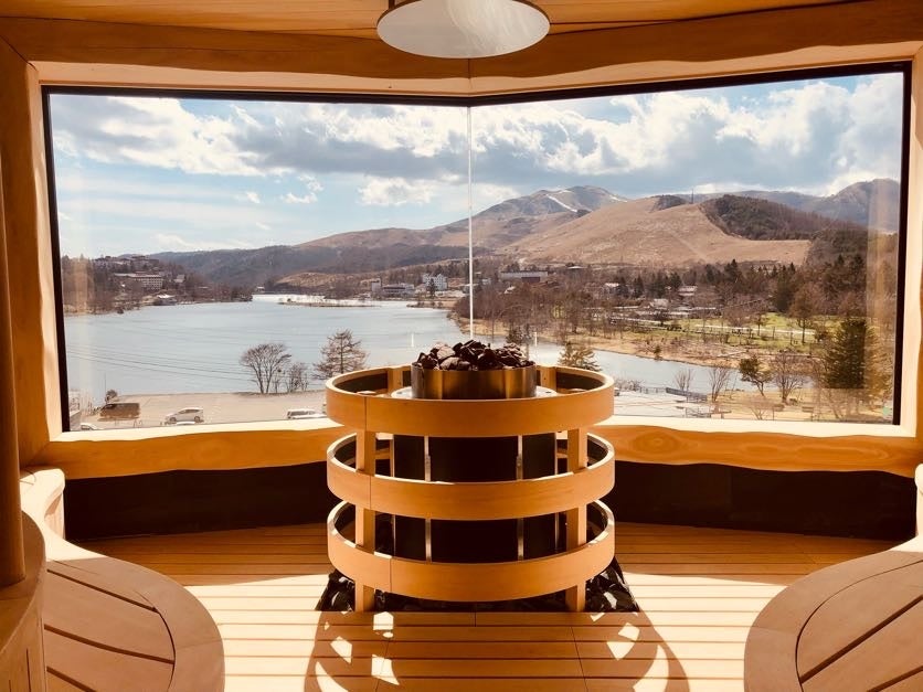 「湖畔混浴 空」の展望サウナには、湖に向けてせり出した大きな窓が立体的に設置され、車山から白樺湖までの風景を大きく切り取ります。インフィニティ設計を採用した各エリアの露天風呂では、湖へ全身が溶け込んでいくような開放感を味わっていただけます。高原の冷涼な風を受けて、空気と一体化するような心地よさを、ぜひ一度ご体感ください。