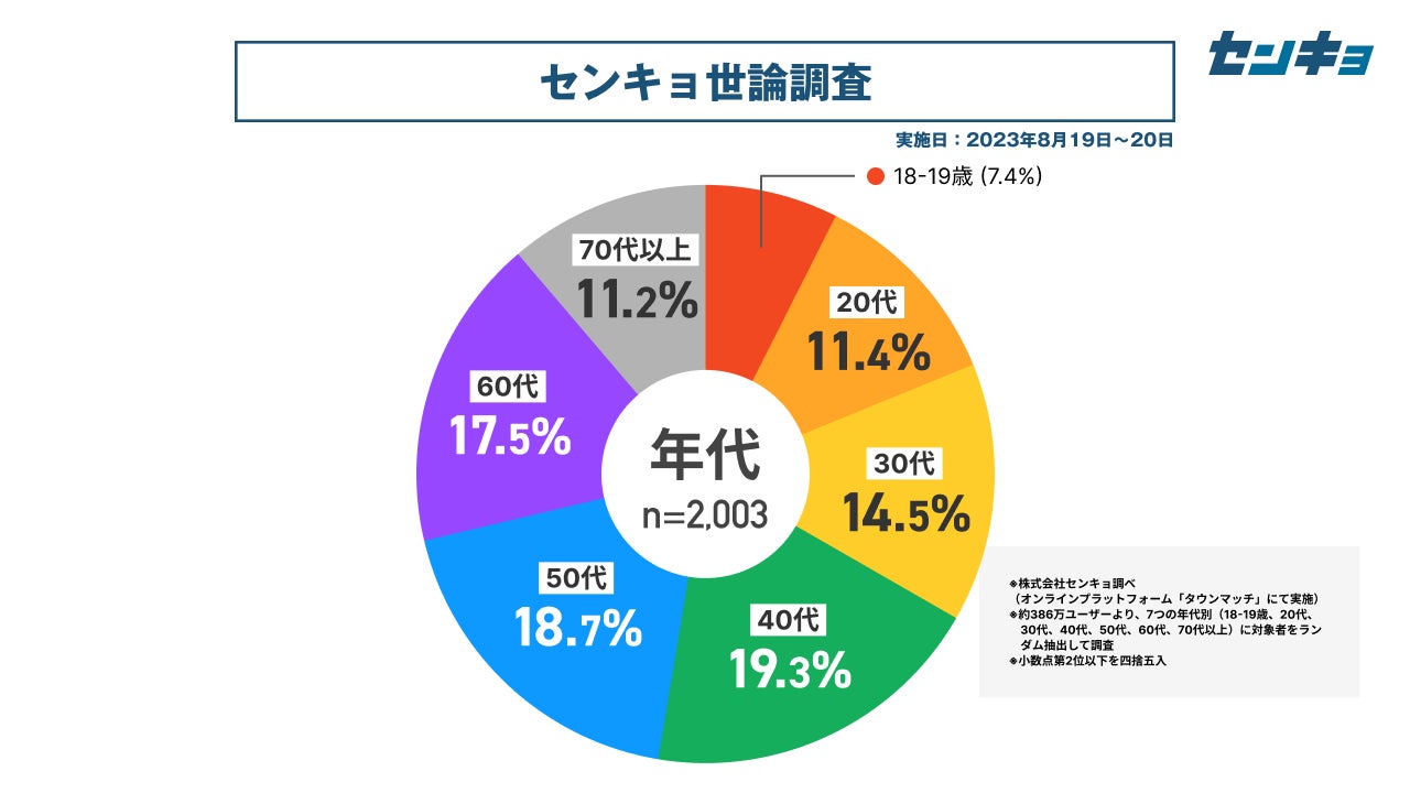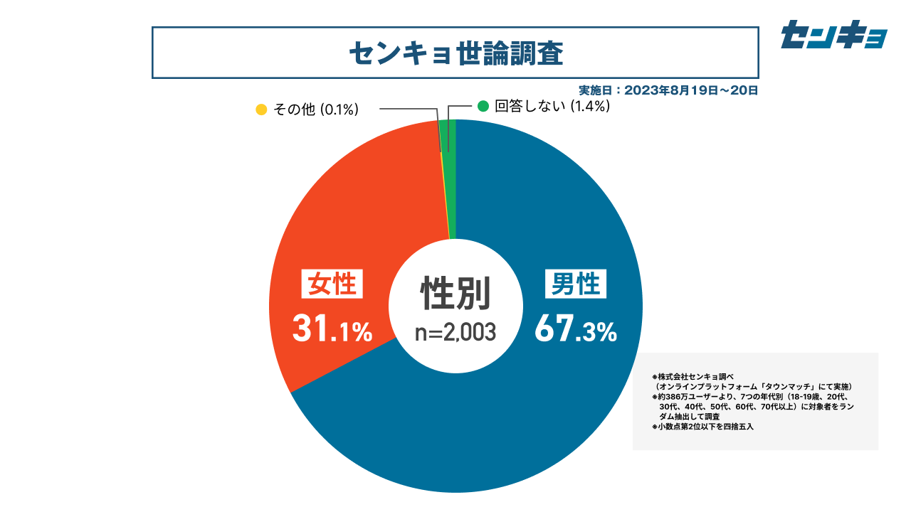 初回となる今月の調査に関しましては、今月19日に、ご自身のプロフィールを回答いただた約360万人の方々の中から、年代別(18-19歳、20代、30代、40代、50代、60代、70代以上の7セグメント)にランダムで対象者を抽出してアンケートをお送りし、20日までに2003名から回答をいただきました。年代、性別、政党支持率、内閣支持率の集計結果は以下のようになりました。