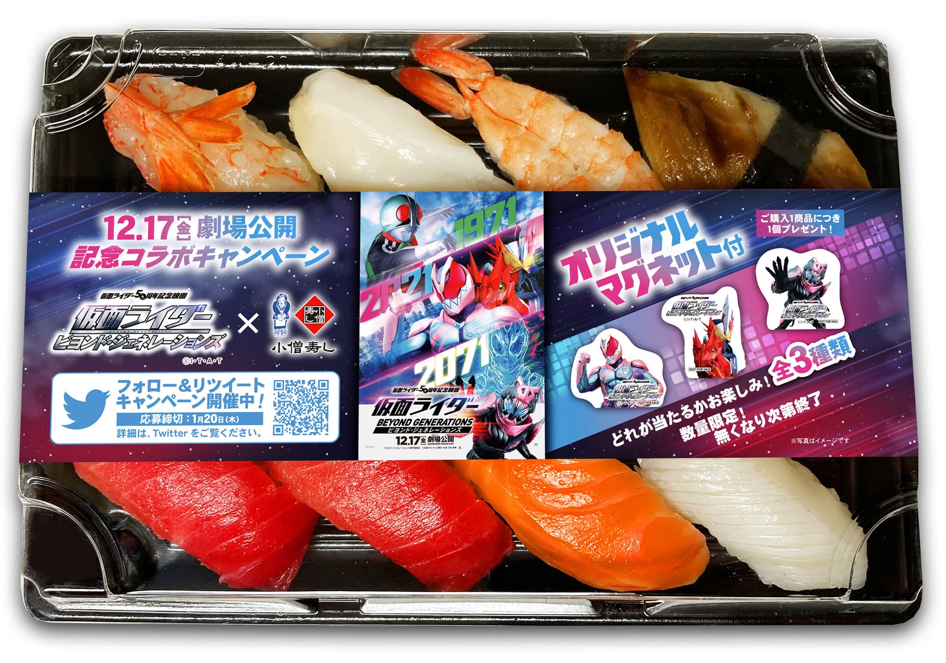 株式会社小僧寿し(東京都中央区、代表取締役・小林剛)は、2022年1月10日(月)~2022年1月20日(木)までの期間限定で、 2021年12月17日(金)公開の仮面ライダー50周年記念映画『仮面ライダー ビヨンド・ジェネレーションズ』(製作:「ビヨンド・ジェネレーションズ」製作委員会 [c] 石森プロ・テレビ朝日・ADK EM・東映 /配給:東映)とのコラボ企画を開催いたします。
