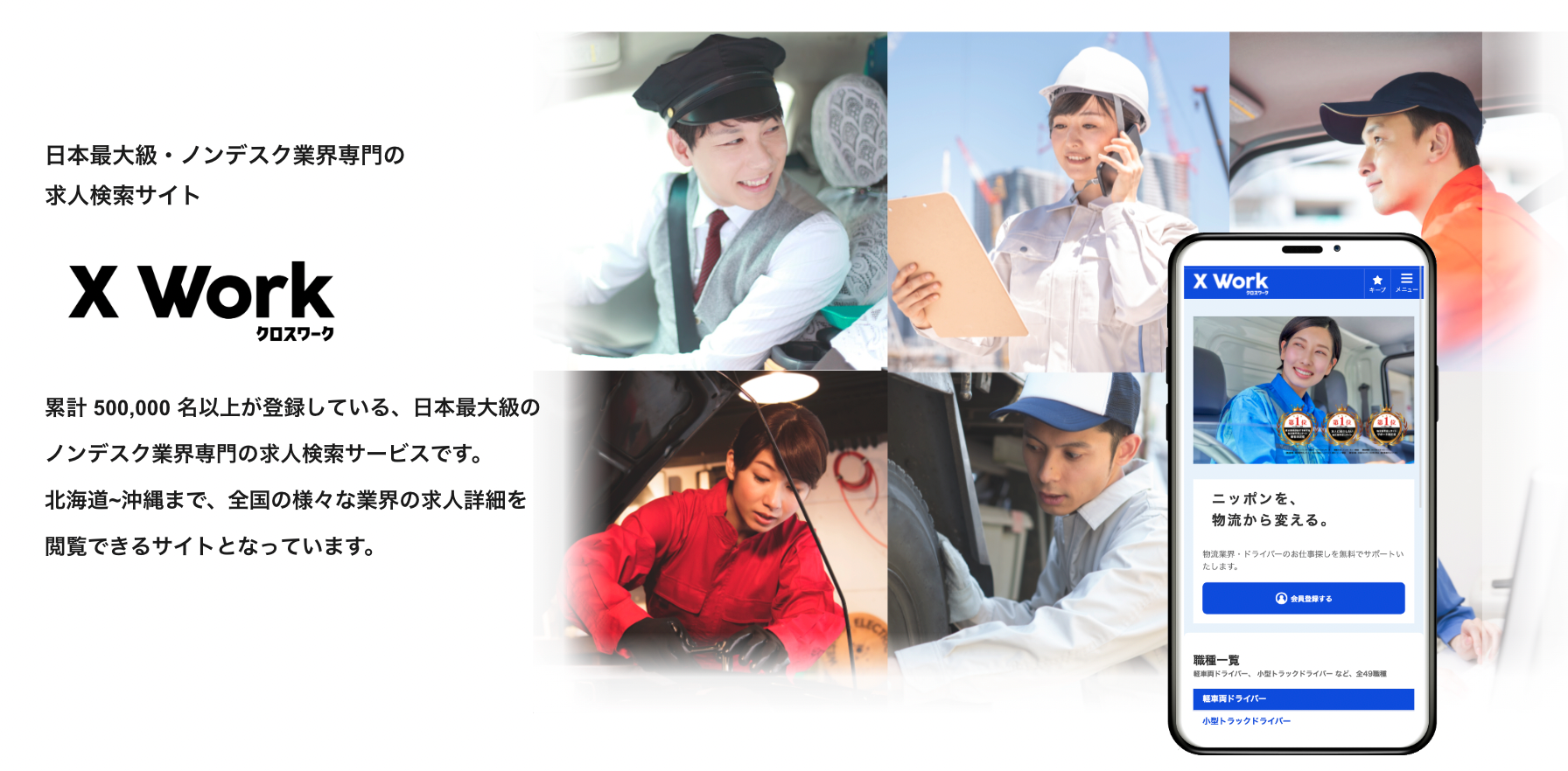 ノンデスク事業者向けの人材採用システム「クロスワーク」、物流領域・自動車整備領域・建設領域に特化したエージェントの「ドライバーキャリア」「整備士キャリア」「建職キャリア」を運営しています。