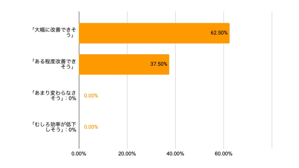 チャットボット導入後の業務効率について職員にアンケートを実施したところ、すべての回答者が業務改善の可能性を感じていることがわかりました。