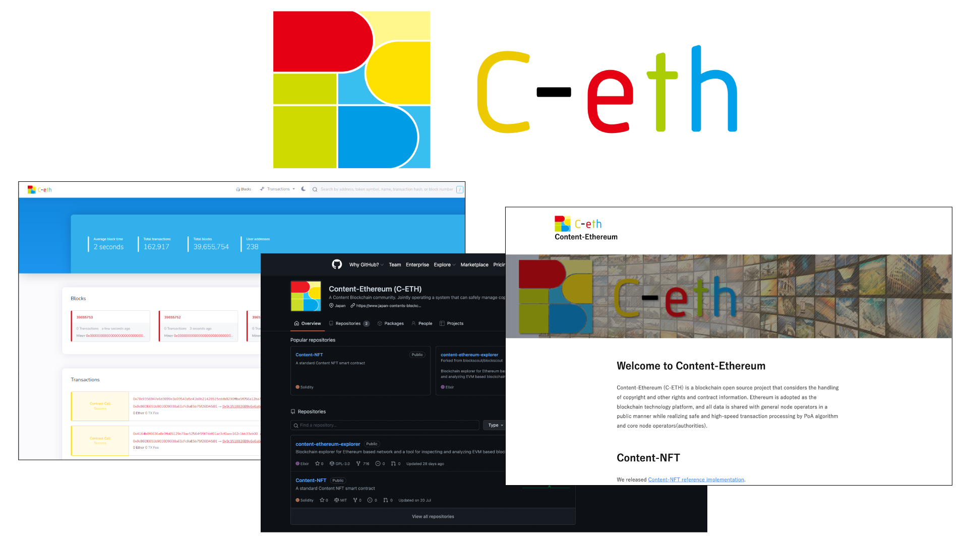 一方、コンテンツを対象とするNFTにフォーカスしたデータモデルを採用しているオープンソースプロジェクトとして、「Content-Ethereum(C-ETH)」があります。このContent-Ethereum(C-ETH)は、著作権等のコンテンツに関連する権利と、当該権利に関する契約情報の取り扱いを考慮したプロジェクトであり、権利や契約に関する包括的な機能を有するERC721型NFTの論理データモデルを有し、パブリックに広くデータが開示されたオープンなブロックチェーンです。電力を過剰に浪費するマイニングは不要であるため環境にやさしく、かつ、資金決済法に規定されるような暗号資産の発行もありません。コミュニティによるガバナンスを有し、ガス代も不要であるなど、無償で利用できる「コンテンツ業界のためのコモンズ」としての発展を目指すプロジェクトです。