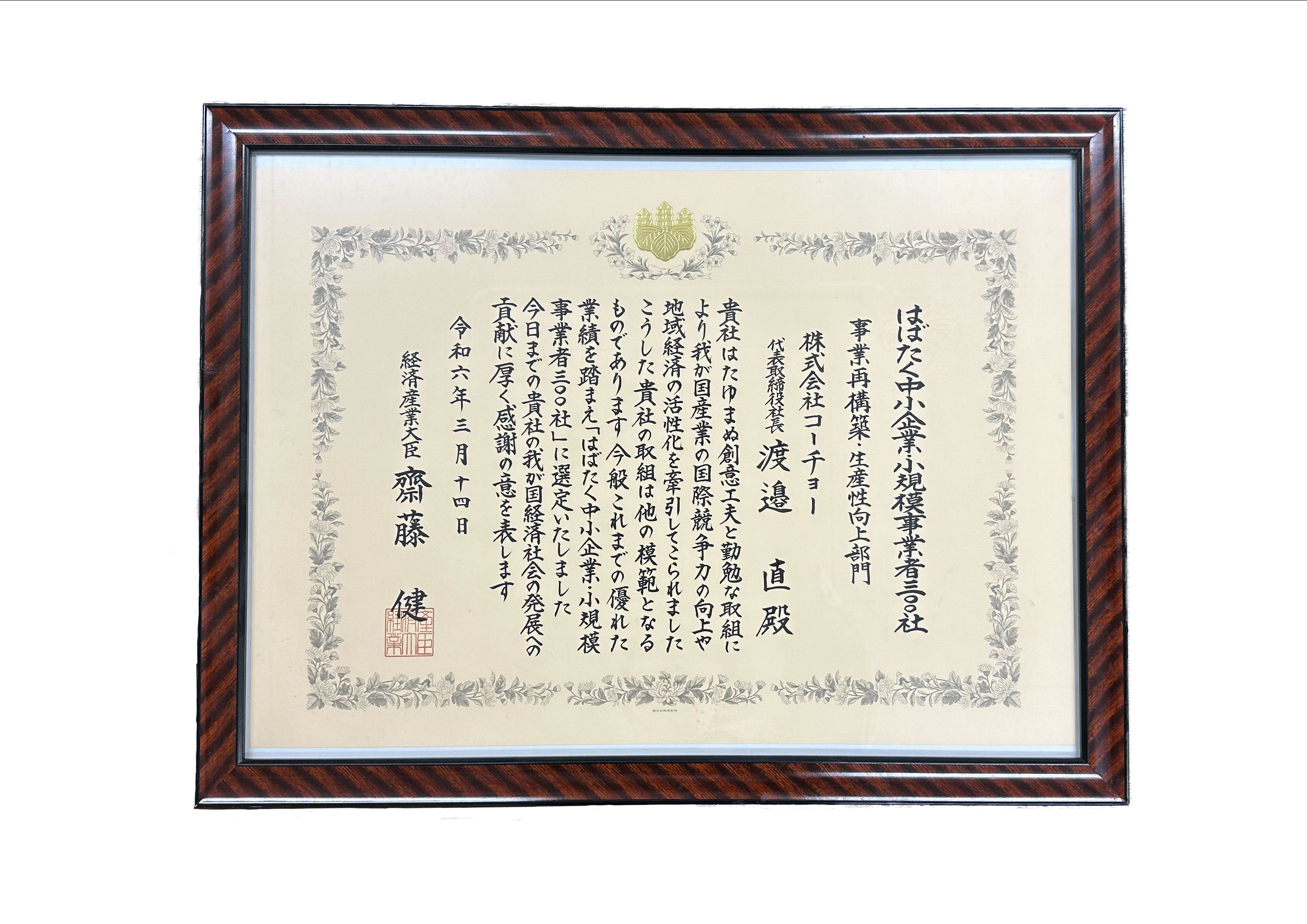 株式会社コーチョーは、経済産業省・中小企業庁が選定する2023年度の「はばたく中小企業・小規模事業者300社」に選出されました。また、2024年3月14日(木)に経済産業省で執り行われました授賞式に出席し、感謝状が授与されました。