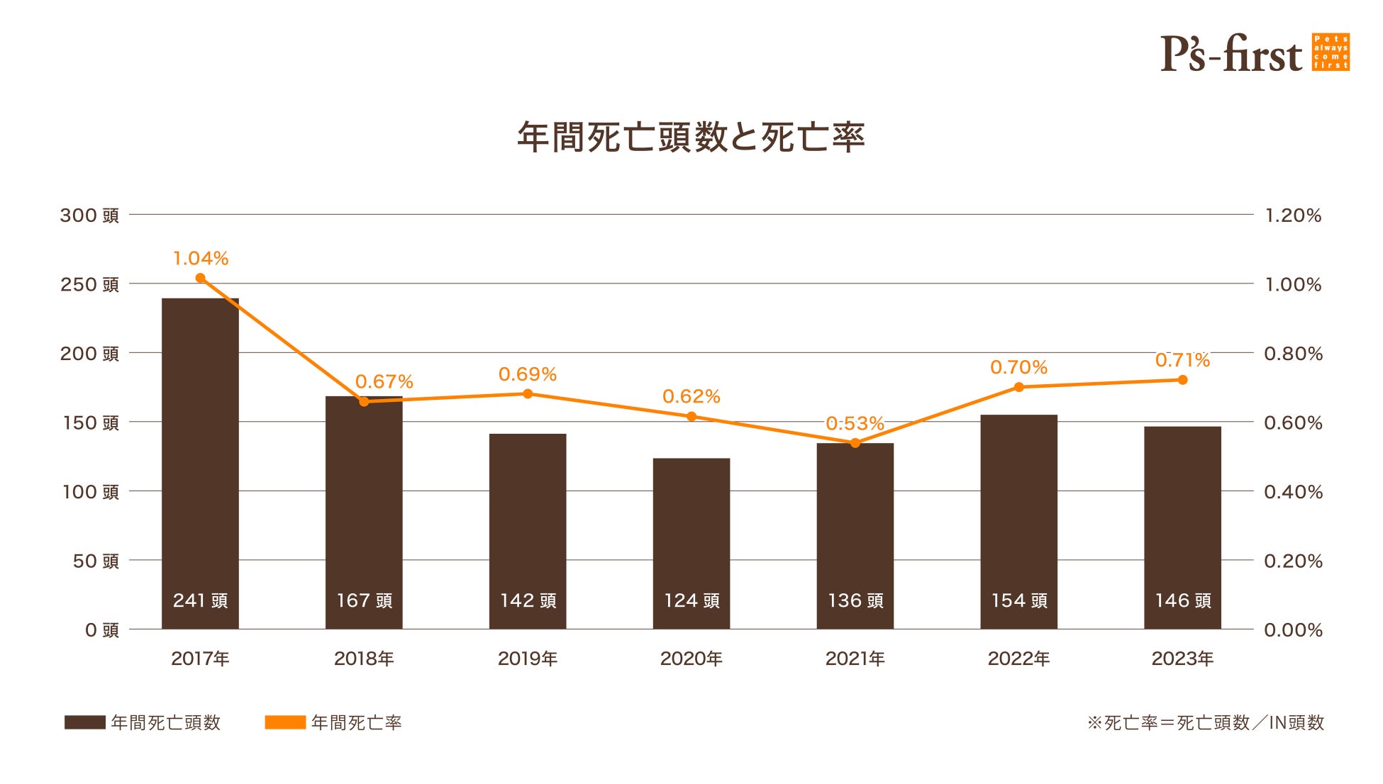 2023 年の死亡事故数は146頭(昨年比-8頭)死亡率として0.71%(昨年比+0.01%)でした。昨年よりも死亡率は悪化していますが、この7年間で大幅に改善しています。