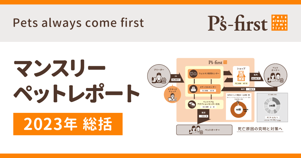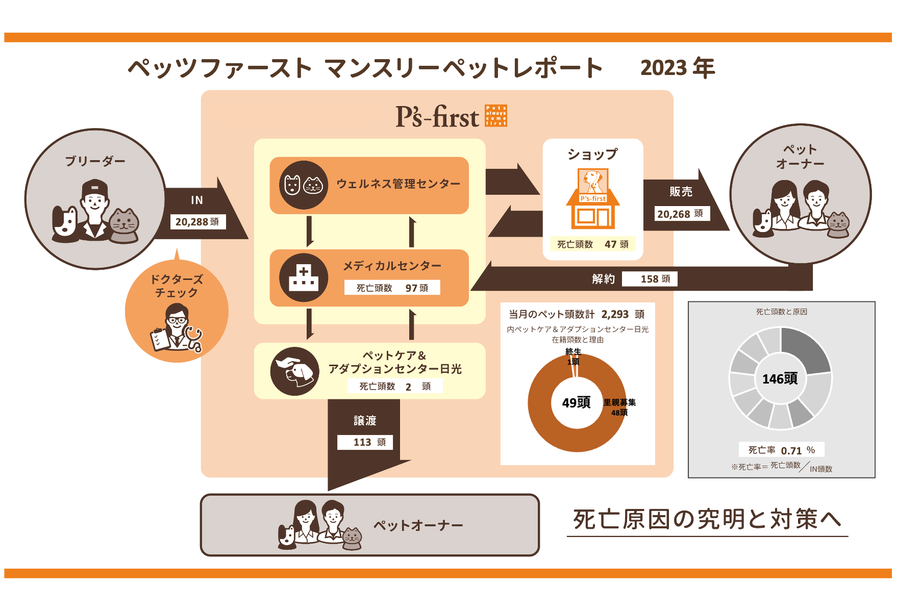 2023 年1月1日から12月31日までにペッツファーストグループが取り扱ったペット、すなわち契約ブリーダーから引き受けたペットの頭数が 20,288 頭、Pʼs-firstでのご契約数は 20,268 頭、Pʼs-first、ペットケア&アダプションセンター⽇光などでの里親譲渡数が113頭、ご解約数が158頭です。