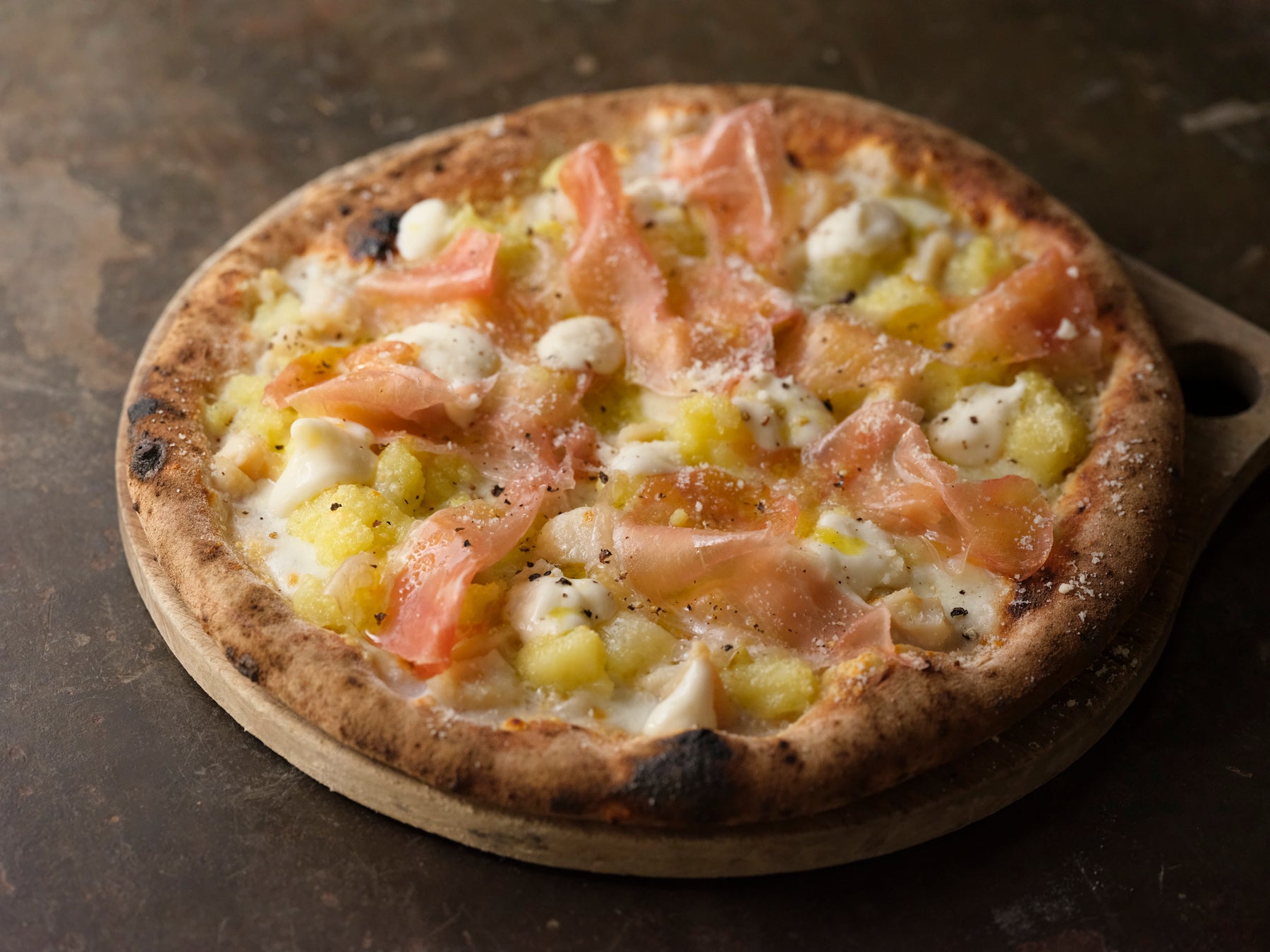 今、Chefs for the Blueの活動を通して海について勉強している最中ですが、「北海道ほたて」は海の環境やこれからの自分たちのアクションを考えるうえで、最適な食材だと思います。料理人も海や魚介類の現状を知り、何かしらの行動をしたいと思っている人が多いですが、具体的に何をすればいいのかわからないことも多いのが現実です。そこで、みんなが行動を起こしやすい第一歩として、「北海道ほたて」を知る機会になればと考えています。ただ、「北海道ほたては...」と説明から入るのではなく、料理人としてできることとして、一番大事なのは北海道ほたての美味しさを料理で伝えることだと思っています。まずは全力でそこに向き合い、お客様から「美味しい」と言ってもらえたときに「実はこれは環境に配慮した北海道ほたてなんです。なぜなら...」と、食べ手に知りたいと思ってもらえる環境をつくること、そこできちんと説明できることが、料理人としての腕の見せ所だと思います。このフェアを通じて、そうした自然な形で、サステナブルな北海道ほたての魅力を少しでも多くの人に伝えていきたいと願っています。さて、今回の「ホタテのピザ」は、北海道ほたてのうま味や甘味を最大限に感じてもらえるよう工夫しました。ホタテは繊細な食材なので、クリーム系など濃厚なソースでその美味しさを100%伝えるのは難しい。そこで、じゃがいも、チーズ、生ハムといったシンプルな組み合わせにし、生ハムの塩味でホタテの甘味を引き立てました。さらに、ホタテから作ったホタテマヨネーズを加えることで、ホタテの美味しさをよりわかりやすく味わえるようにしています。北海道ほたての魅力をしっかりと楽しめる一品になったと思います。