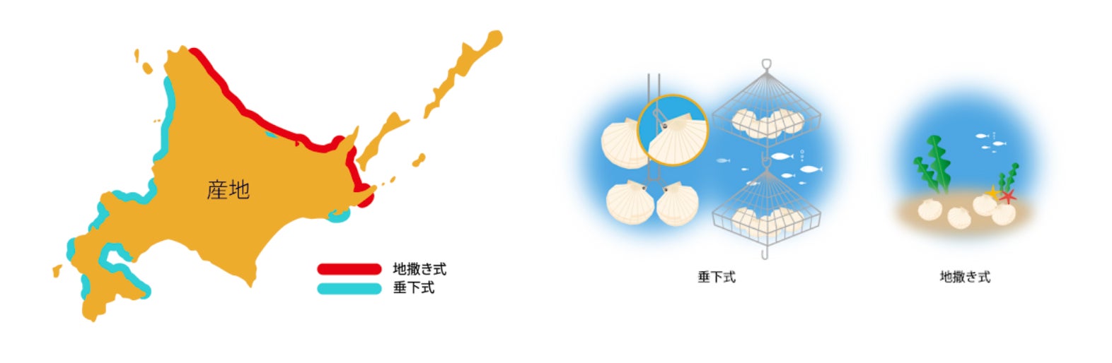 ① 地蒔き式(天然):海域を区切り、毎年稚貝を放流して育成します。成貝に成長した時点で漁獲・水揚げを行います。この方法は、オホーツク海と根室海峡の沿岸域で行われています。