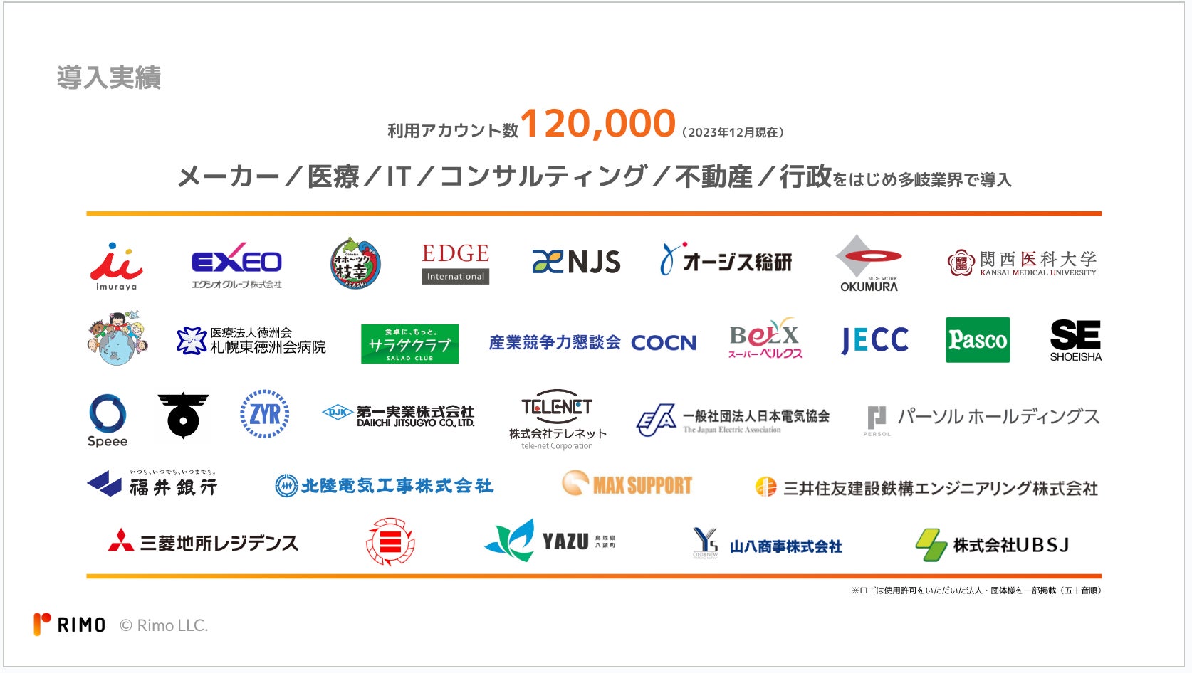 従来のSaaS製品である『Rimo Voice』は、日本語特化による精度の高さや高速処理・話者分離などの技術力が評価され、大手エンタープライズ企業様を中心に12万アカウントを超える導入実績を誇っています。