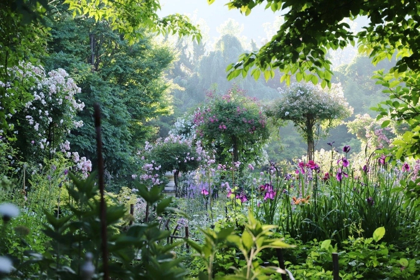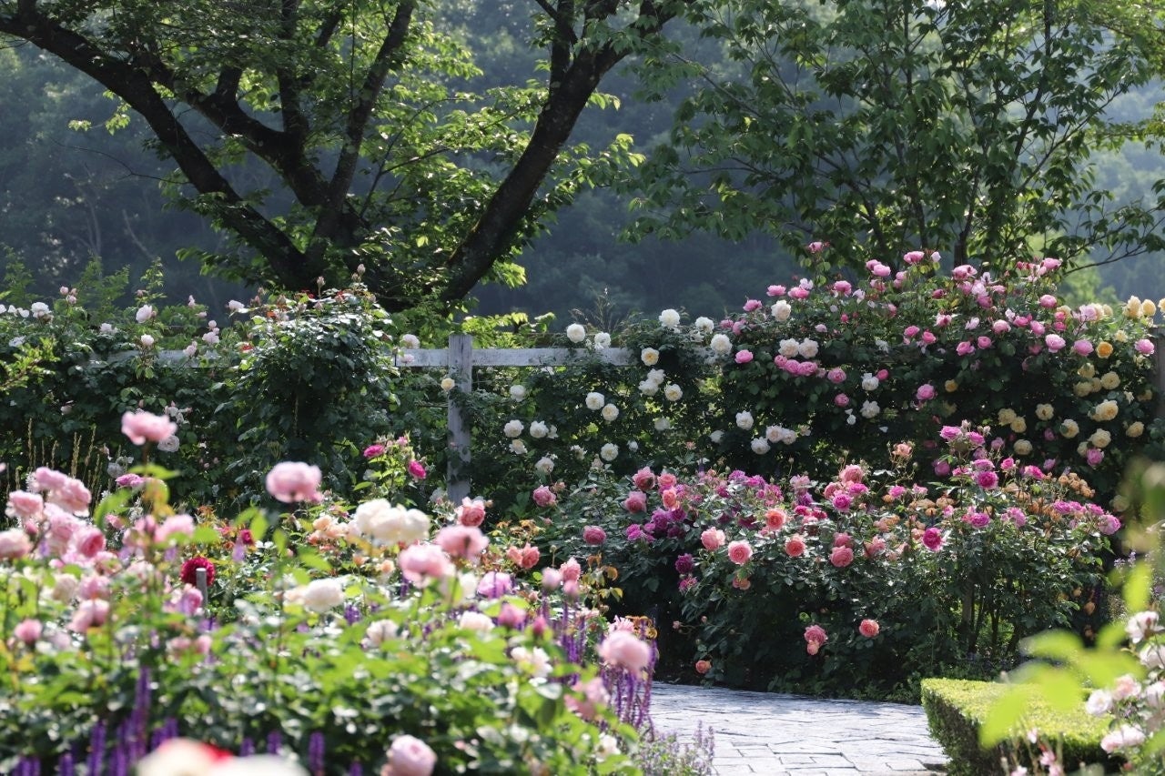 神秘的な朝バラが始まりを告げる!花と緑が奏でる湖国の庭園「ローザンベリー多和田」にバラと宿根草の美しい世界が広がります