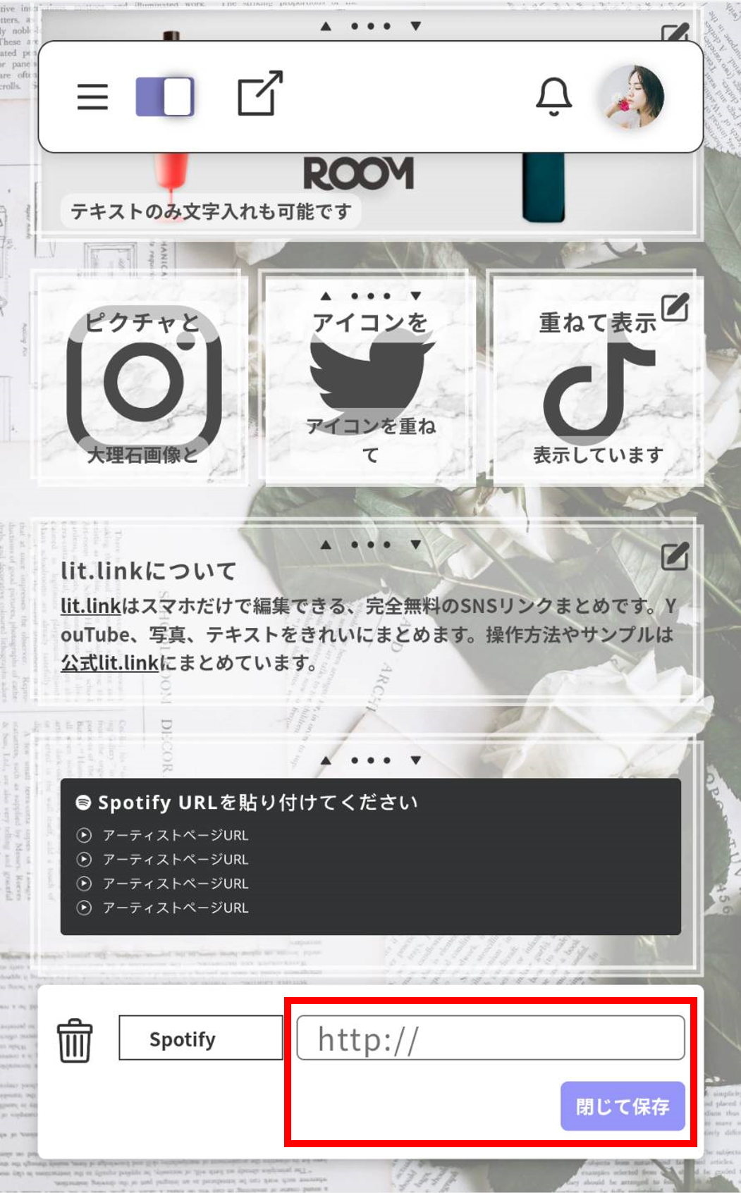 ③埋め込みたいSpotify内の曲やアルバムのページのURLを入力、「閉じて保存」ボタンを押す
