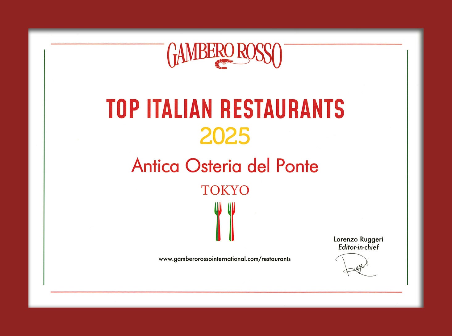 アンティカ オステリア デル ポンテ が、ガンベロロッソ発行「世界のトップ・イタリアンレストラン」東京版(2025年度版)で3年連続2フォークを受賞!