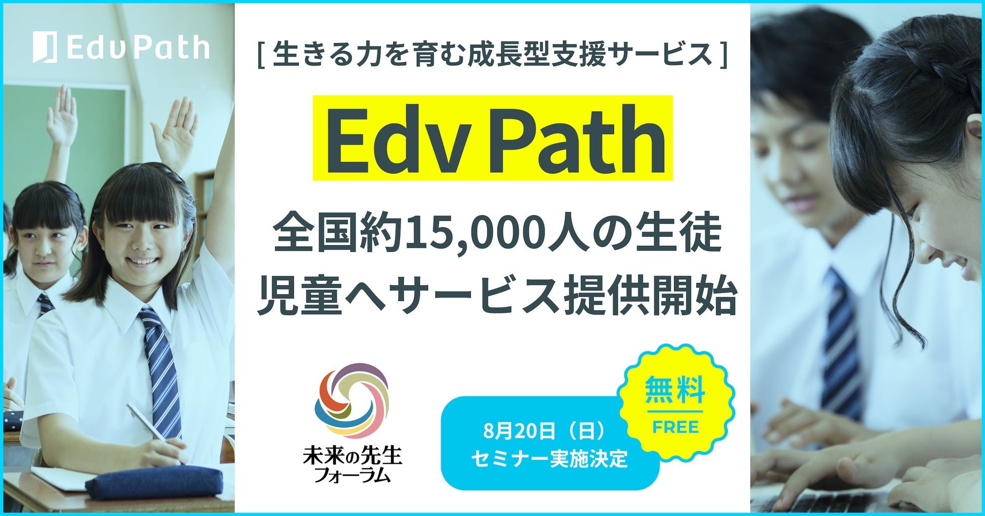 Edv Future株式会社(本社:東京都新宿区、代表取締役:山崎泰正)は、生きる力を育む成長型支援サービス「Edv Path(エデュパス)」が、経済産業省が実施する「探究的な学び支援補助金2023」に採択されたことを受け、2023年度の期間、全国29都道府県・約15,000名へのサービス提供を開始いたします。またこれに伴い、8月7日(月)より経済産業省が運営する、先生のための探究・情報教育支援ポータルサイト「探究先生」( https://tankyu-semi.go.jp/ )に「Edv Path」が掲載されています。