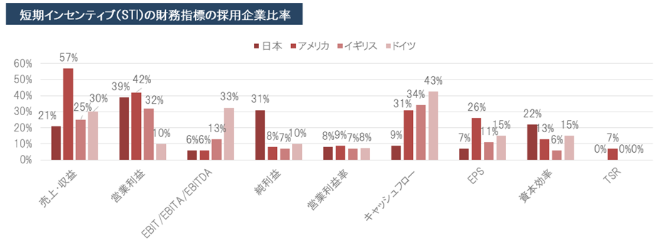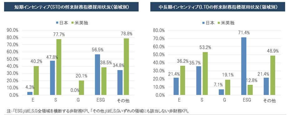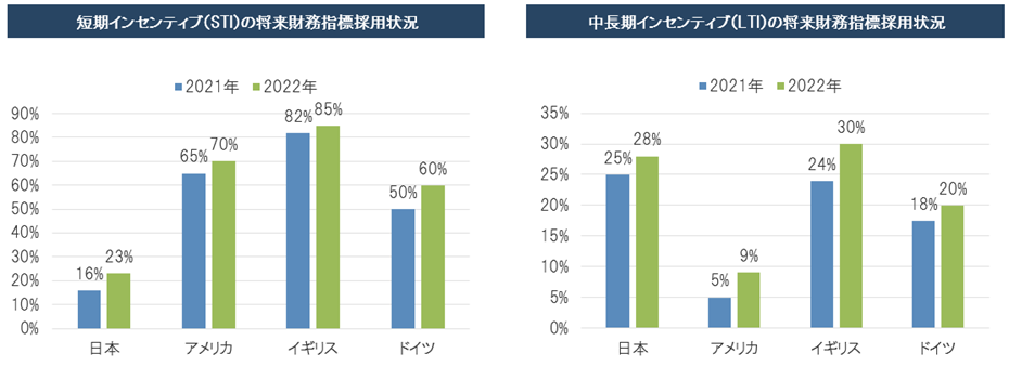 - 非財務指標(将来財務指標)を採用する日本企業の割合は、STIで23%、LTIで28%であり、前年から増加している。海外企業はSTIで将来財務指標を採用する傾向がある一方、日本企業はLTIで将来財務指標を採用する傾向がある