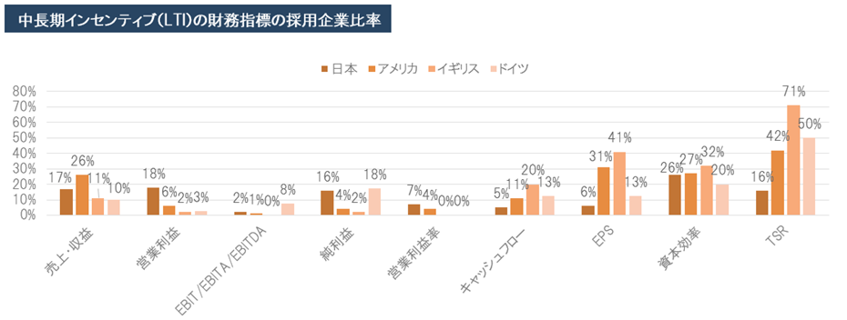 日本企業はSTIにおいて、営業利益や純利益に関する指標を採用する企業が多い一方、欧米企業と比較して、キャッシュフローや1株当たり利益(EPS)に関する指標を採用する企業は少ない傾向がみられました(図表4)。欧米企業のSTIの業績評価指標について、前年と比較して、純利益を採用する企業の割合は減少し、営業利益を採用する企業の割合は増加していました。また、日本企業はLTIにおいて、資本効率に関する指標を採用する企業が多い一方、欧米企業と比較して、EPS、株主総利回り(TSR)に関する指標を採用する企業が圧倒的に少ない傾向がみられました。(図表4)