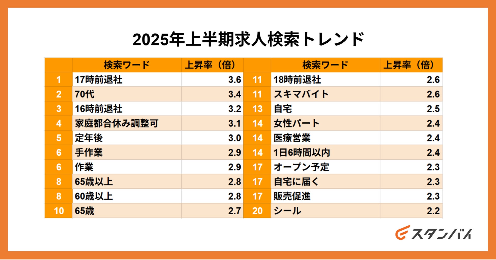 株式会社スタンバイが運営する求人情報一括検索サイト「スタンバイ」(https://jp.stanby.com/)は、2025年1月1日〜2025年5月31日に仕事探しに使用された検索ワードをもとにした「2025年上半期求人検索トレンド」を発表します。