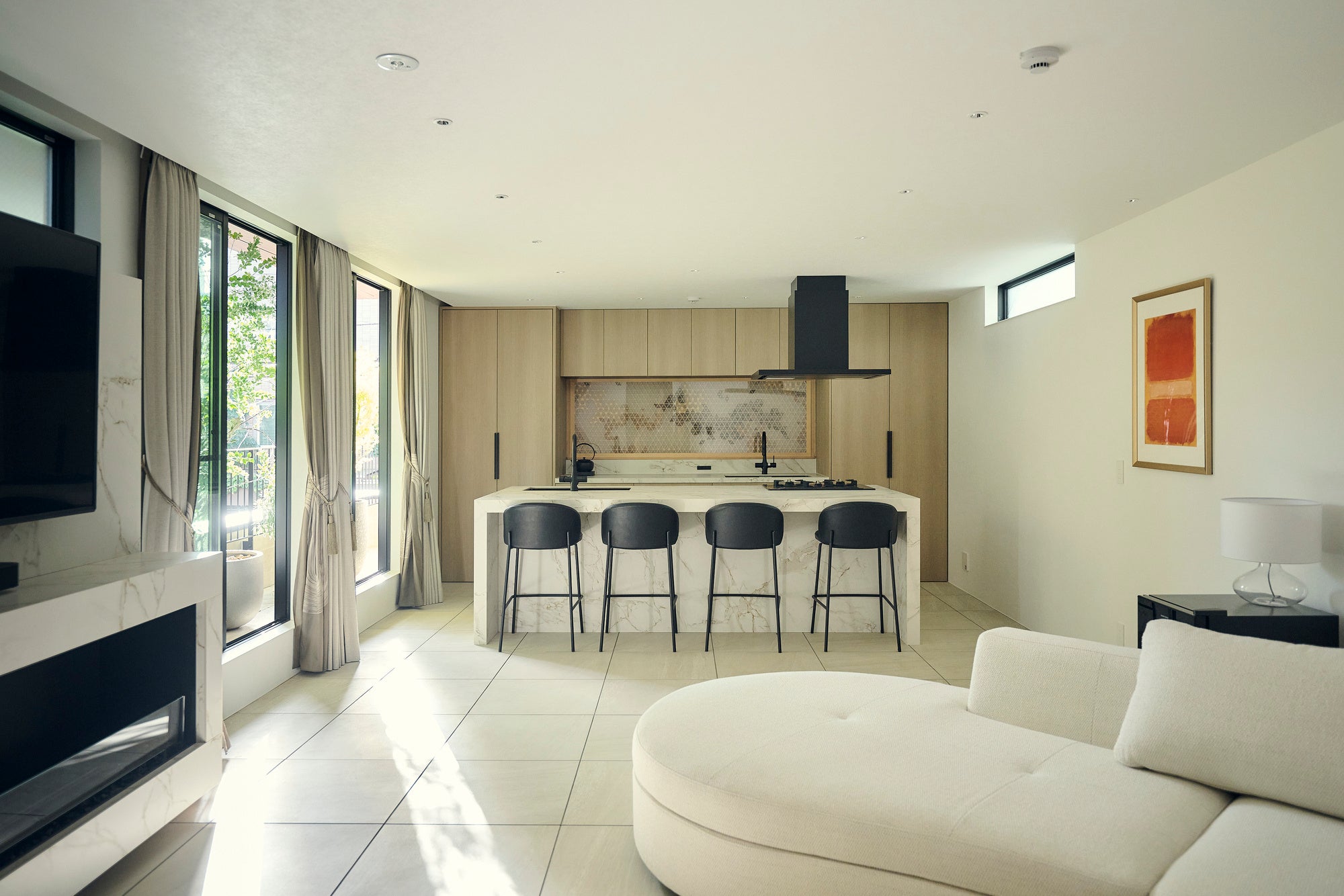 大型ソファに白亜のアイランドキッチン。