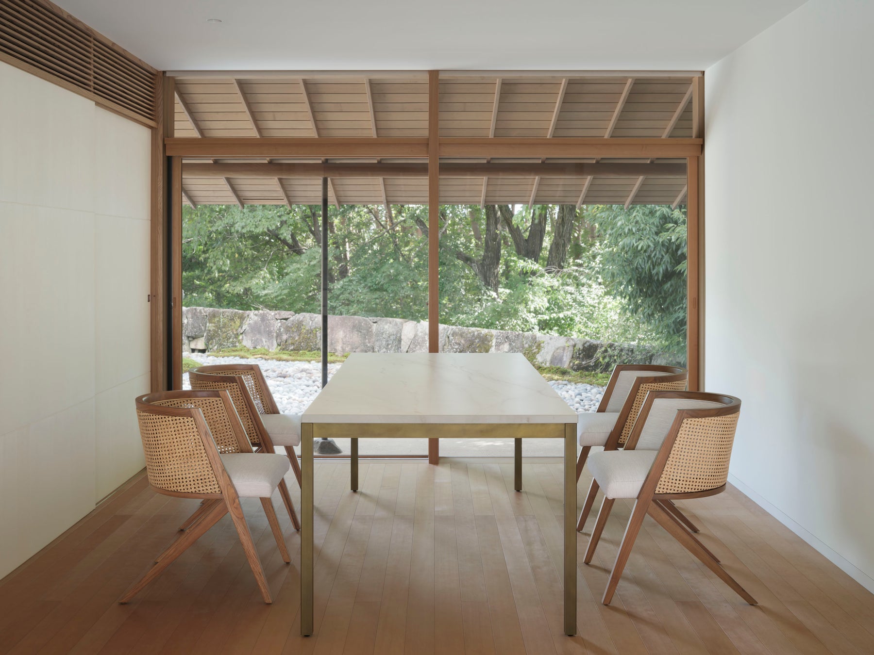 籐の軽やかさと木の構造美が響き合う、現代的なダイニングチェア。