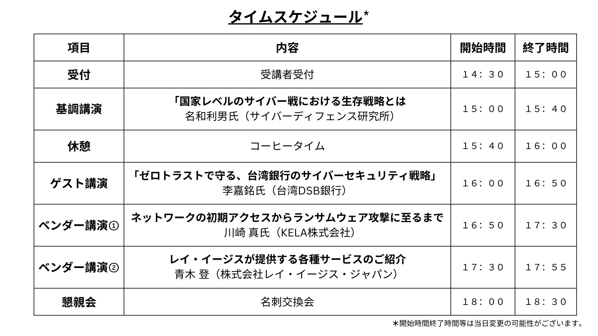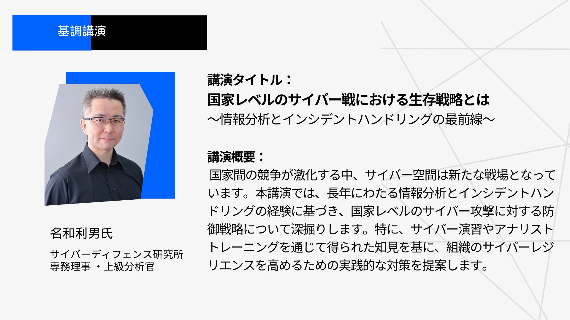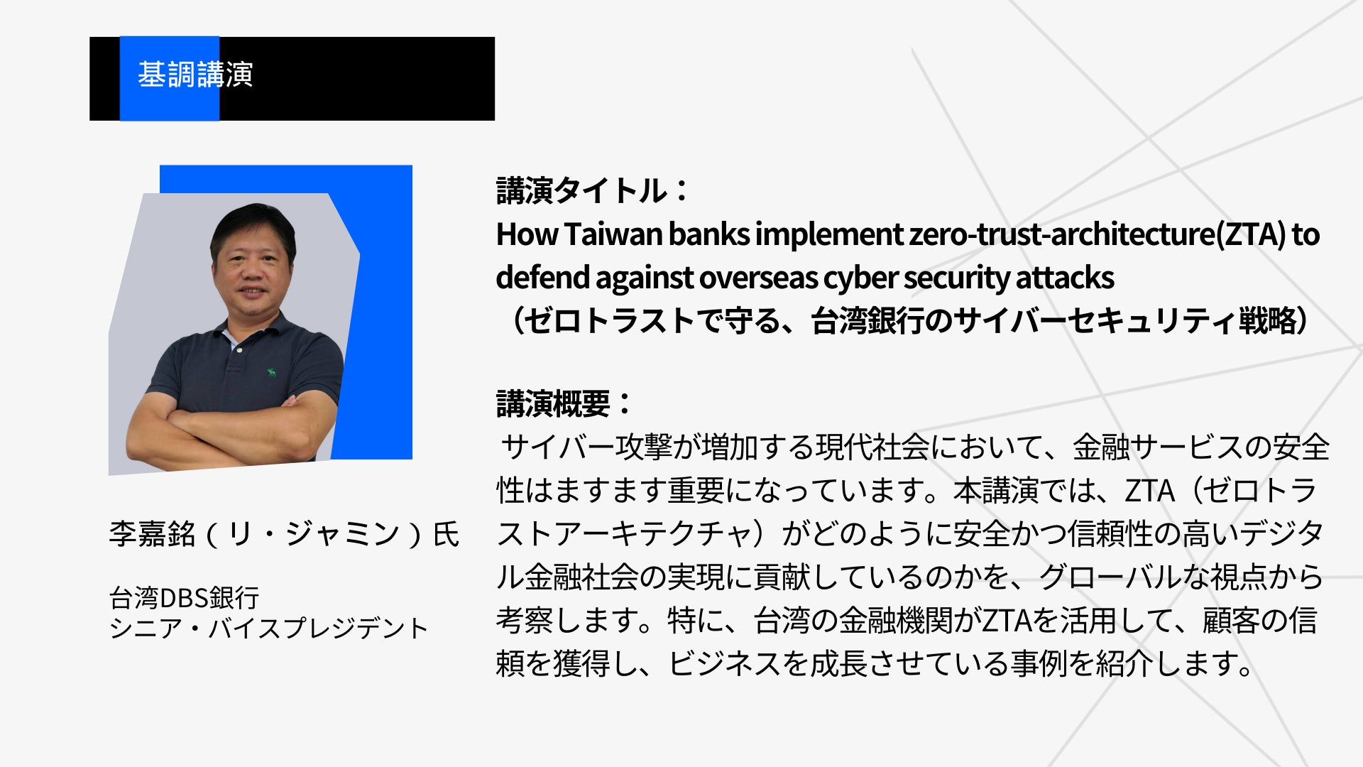 今回、基調講演を行うのは、サイバーディフェンス研究所の名和利男氏。本講演で、名和氏は、国家レベルのサイバー攻撃から身を守るための戦略についてご講演されます。さらに、台湾DBS銀行(世界最高のデジタルバンクとして知られるDBS銀行の台湾法人)から李嘉銘氏が現在日本でも話題になっている「ゼロトラストアーキテクチャ」の導入事例を紹介し、セキュリティ対策の具体的な手法を明らかにします。