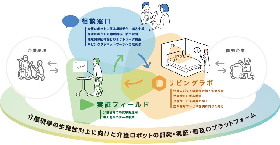 この事業は、地域における相談窓口の設置、介護ロボットの評価・効果検証を実施するリビングラボ(開発の促進機関)を含む関係機関のネットワークの形成、実証フィールドの整備などを行うことで、全国版プラットフォームを構築し、介護ロボットの開発・実証・普及の流れを加速化することを目指しています。併せて、令和5年度当初予算において立ち上げる、地域医療介護総合確保基金を活用した「介護生産性向上推進総合事業」等、都道府県が主体となり進める介護現場の生産性向上の取組について、支援を実施します。