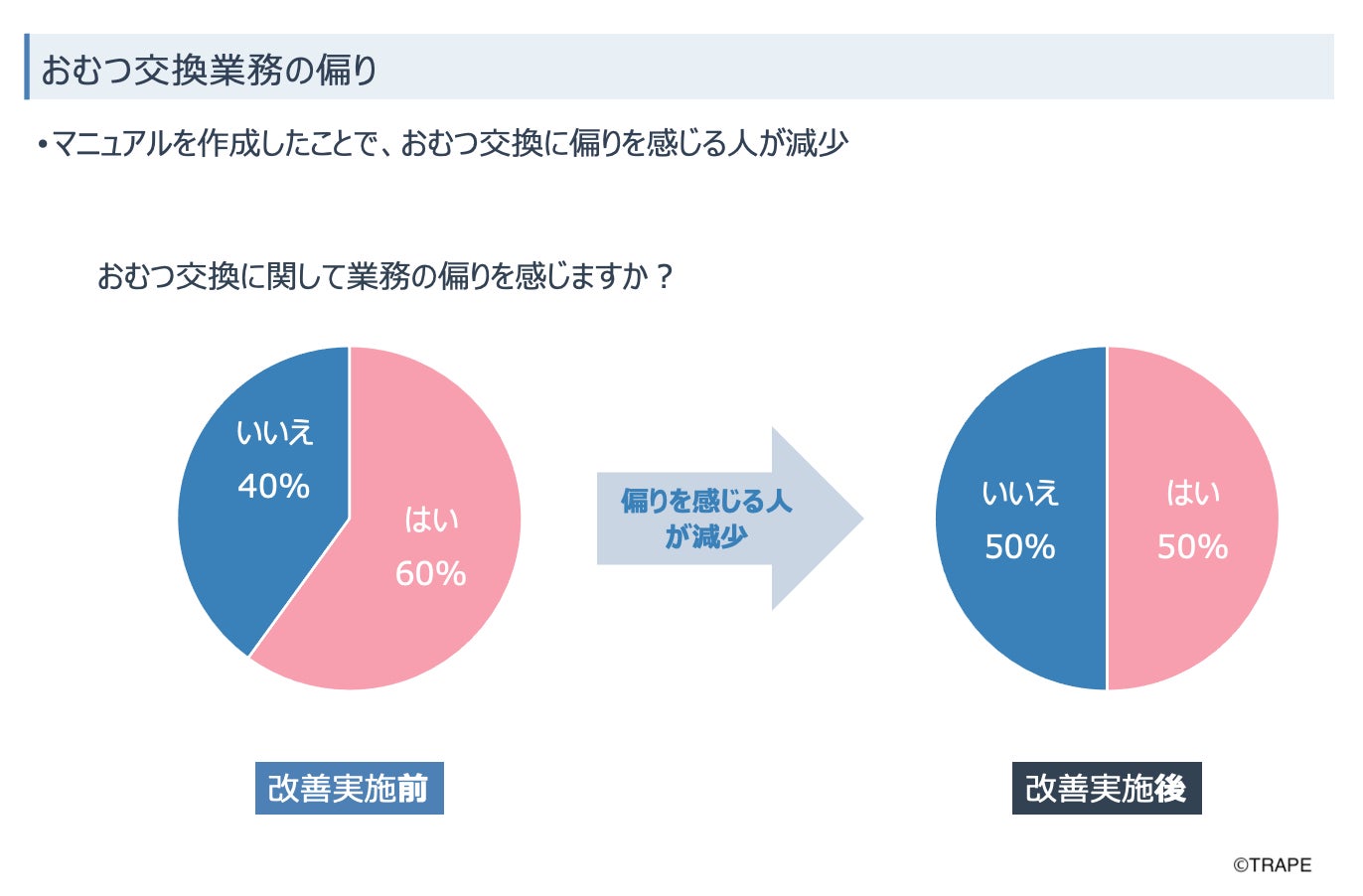 おむつ交換業務における職員間の偏りが減少し、業務全般においても突発業務が減少した