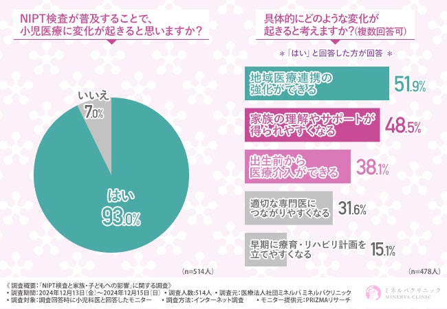 「NIPT検査が普及することで、小児医療に変化が起きると思いますか?」と質問したところ、9割以上の方が『はい(93.0%)』と回答しました。