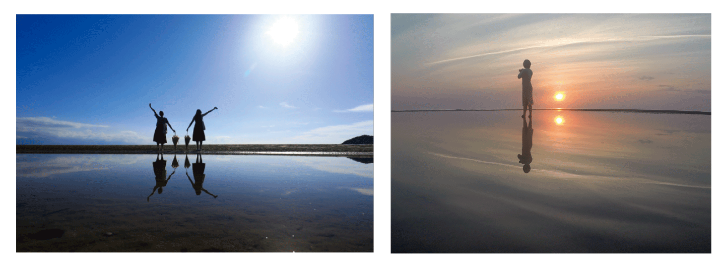 潮が引いた干潮時の夕暮れには、南米ボリビアの「ウユニ塩湖」のような写真が撮れると話題に。