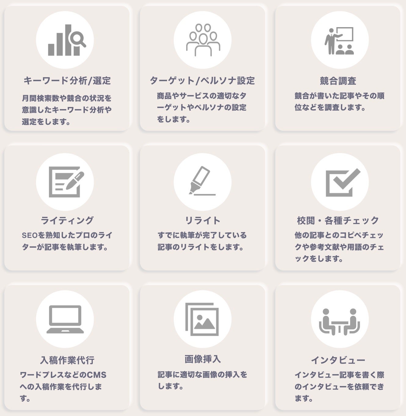 依頼キーワードでの執筆だけでなく、クライアントのオウンドメディアやブログ、サービスに最適なキーワードの分析や選定、競合調査、ペルソナ設計など、コンテンツを制作するにあたって幅広いサービスを提供しています。また、インタビュー記事では実際のインタビュー、またワードプレスなどのCMSへの入稿作業も依頼することが可能です。