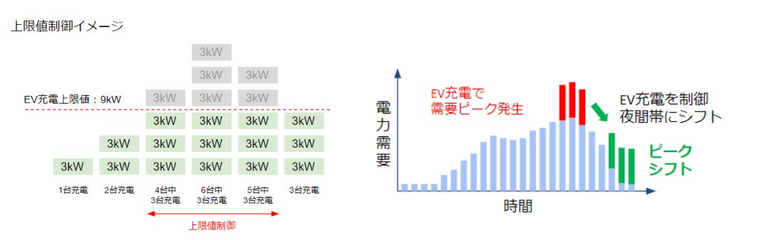 本製品を設置することにより、複数台のEVの充電を事前に設定した上限値(kW)の範囲内で制御する「上限値制御」(図1参照)や、事前に設定した時間まで充電開始タイミングをシフトする「スケジュール制御」(同)、電力市場価格に連動して充電電力量を制御する「市場価格連動制御」が可能となります。また、充電時間や充電電力量を計測し、車両単位で充電データを集計するなど、車両管理の高度化に役立てることもできます。