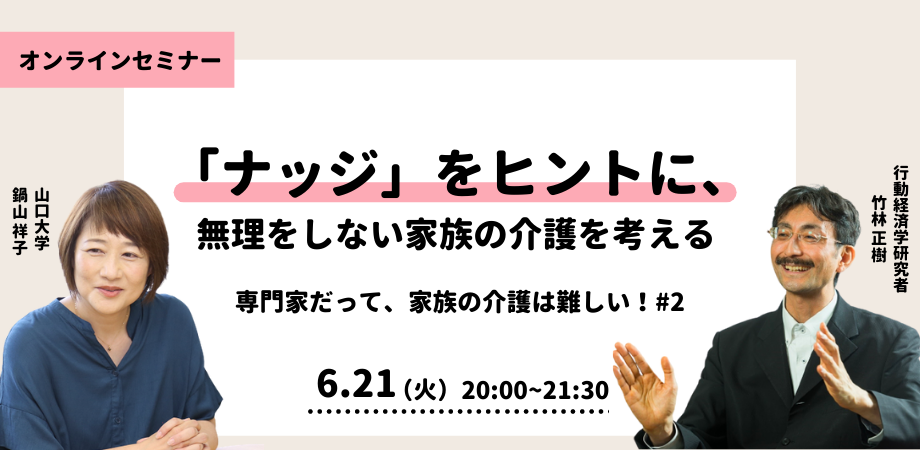 6月21日、オンラインイベント「「ナッジ」をヒントに、無理をしない家族の介護を考える。」を開催します。今、医療介護や予防分野、ビジネス、政策等で注目を集めているのが「ナッジ」です。ナッジとは、よい選択をするように「そっと後押しする」こと。ゲストにはナッジの専門家の竹林 正樹さん、「高齢者介護」や「遠距離介護」「ワーク・ライフ・バランスに焦点を当てた男女の生き方」の研究を行う、山口大学 経済学部教授の鍋山 祥子さんをお迎えし、「ナッジ」で家族の介護、日本の介護はどのように変えていくことができるのかをお聞きします。