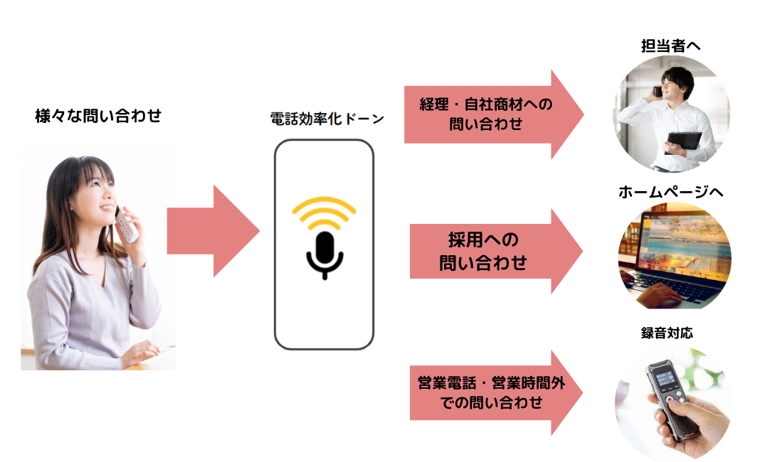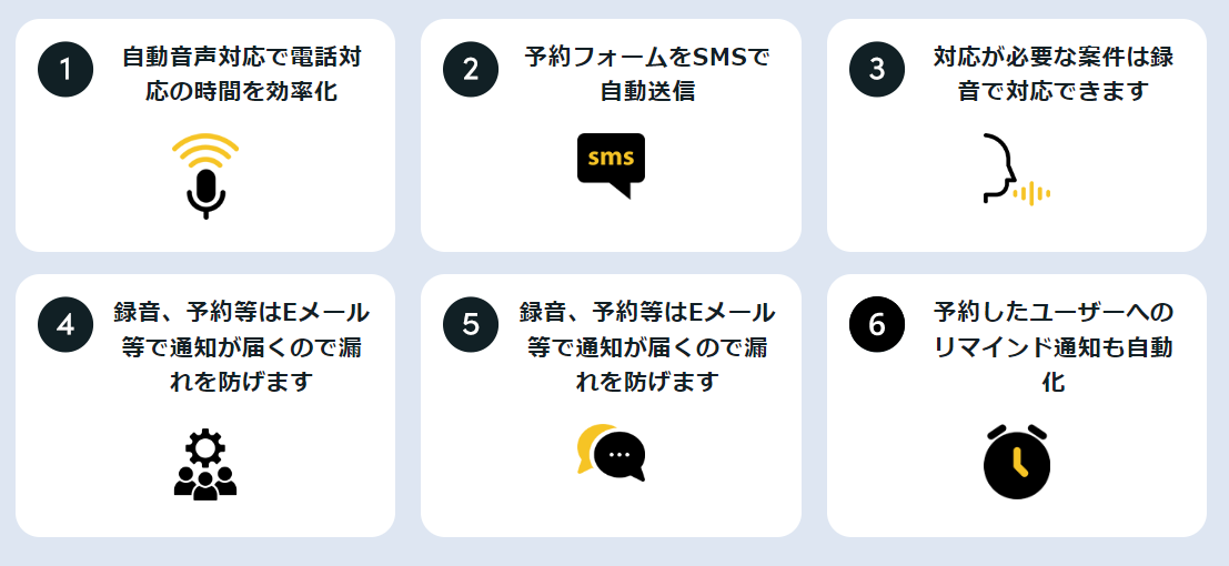 ユーザーから店舗にかかってきた電話を音声ガイダンスが対応するため、一時受付が不要となります。当日のご予約などは店舗へ直接お電話を繋げることも可能です。音声ガイダンスの設定を店舗で行うことができるため、設定によってユーザーのSMSへメッセージを飛ばすことや、ユーザーが留守番電話のように音声を録音することが可能です。ユーザーが音声録音後、録音された音声が文章となり、チャットワークやメールアドレス宛へメッセージとして送ることもできます。