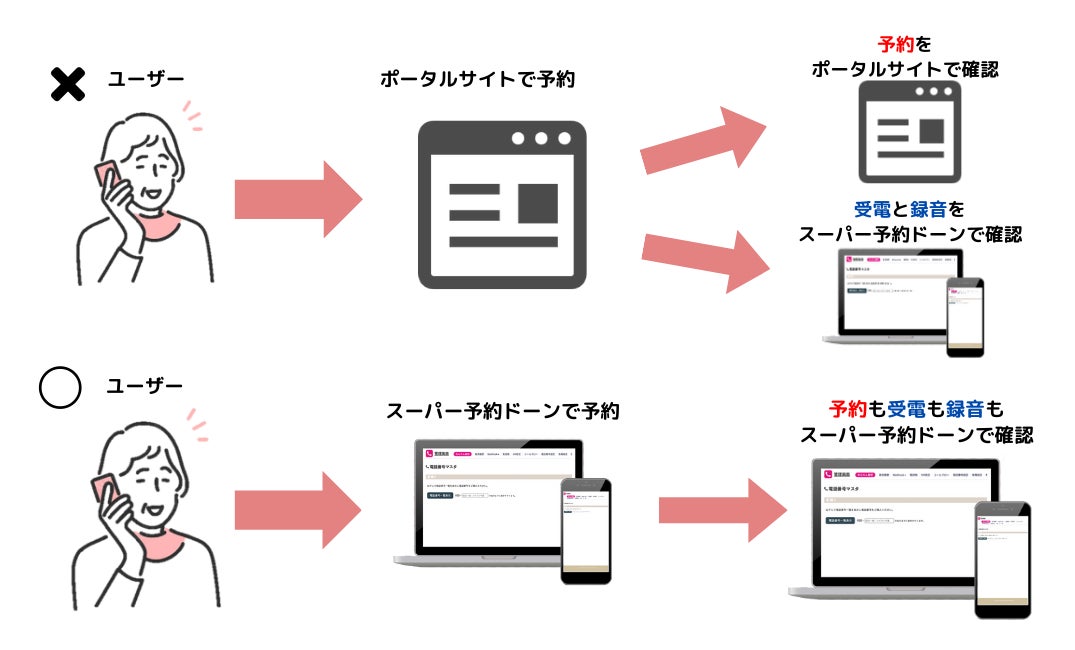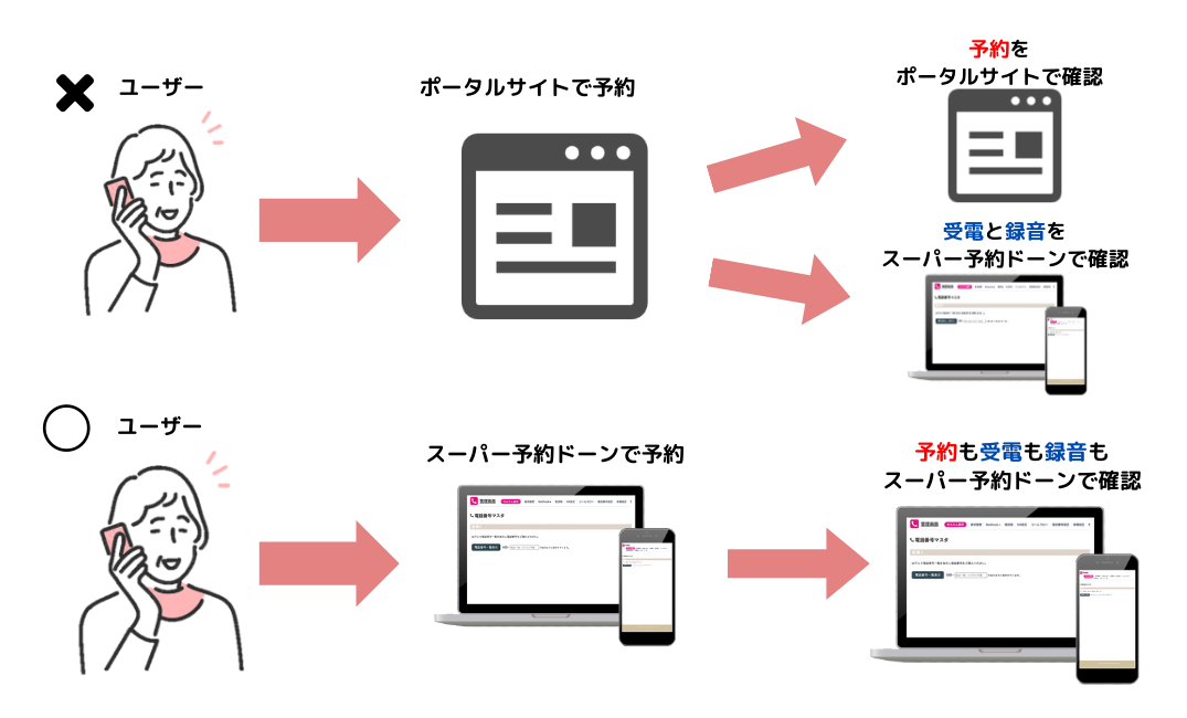 スーパー予約ドーンとは、電話の一次対応を不要にするサービスです。ユーザーから飲食店や美容室へかかってきた電話を「スーパー予約ドーン」で代わりに一次受付いたします。